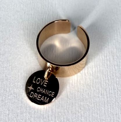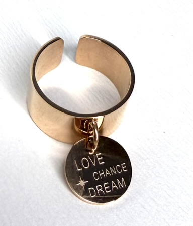 Laisse-toi séduire par cette bague dorée rose réglable, ornée d’une breloque gravée des mots LOVE, CHANCE, DREAM, un message inspirant qui symbolise la confiance, l’amour et les rêves à réaliser.