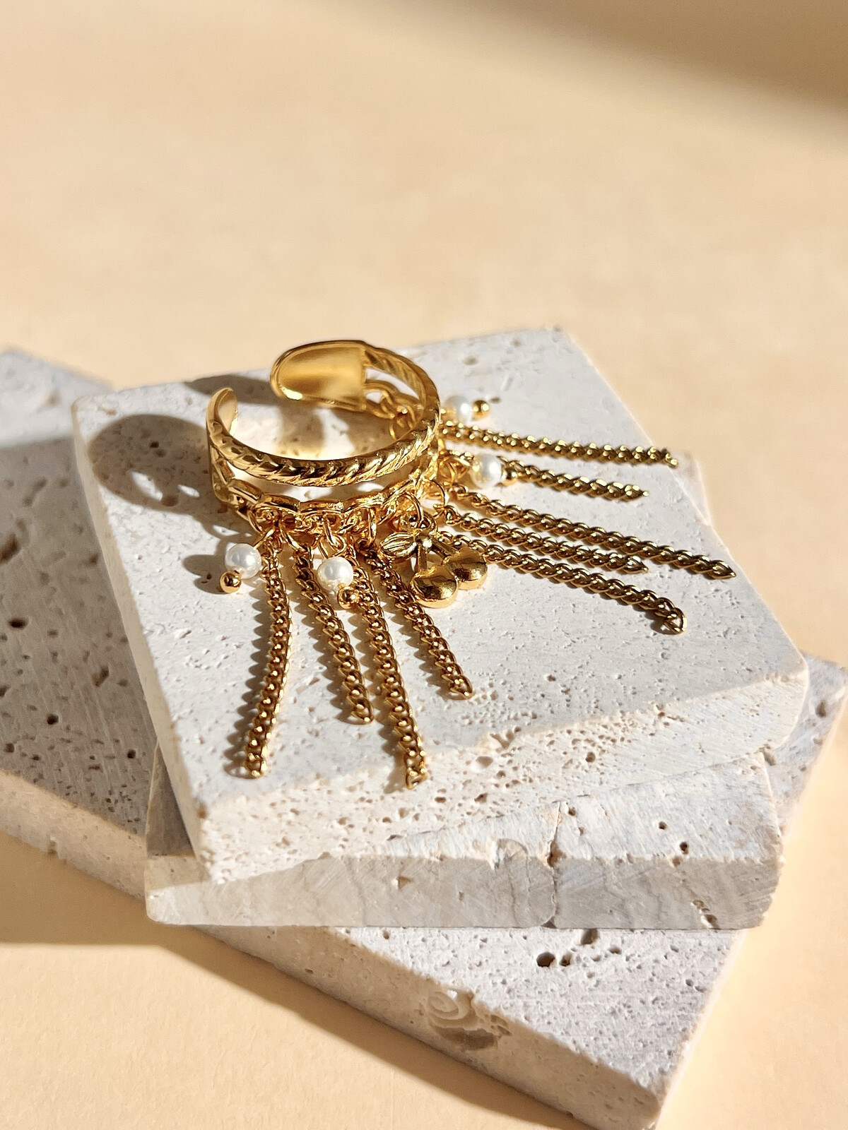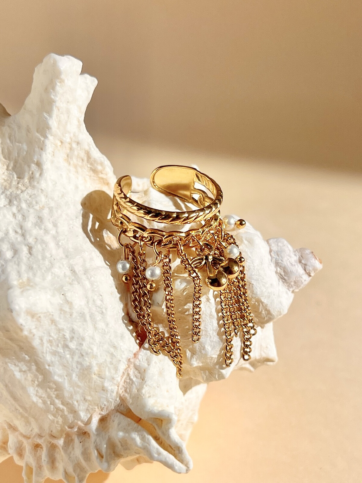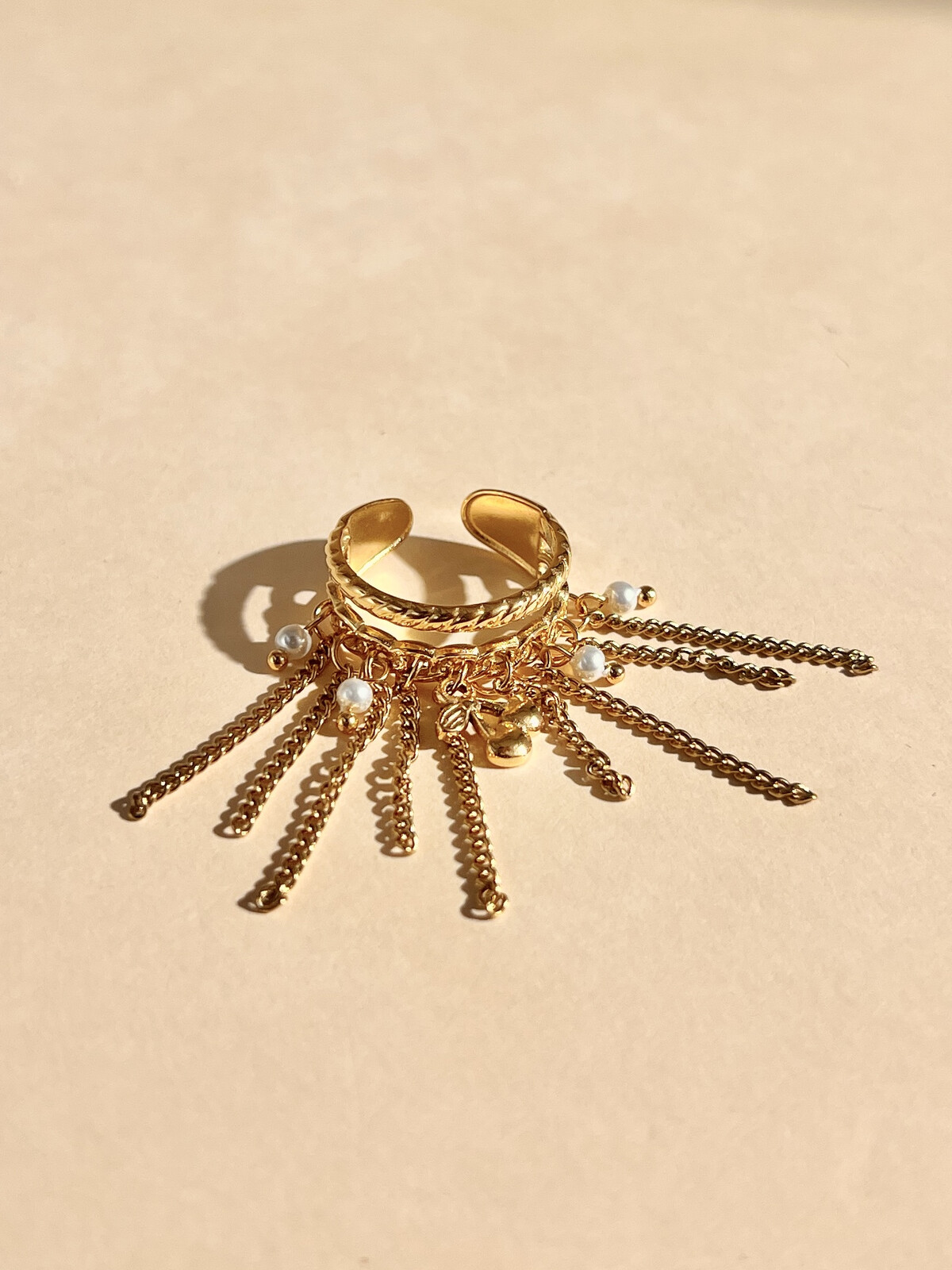 Ose la touche d’originalité avec cette bague réglable dorée, ornée de chaînettes délicates et d’une breloque cerise scintillante.