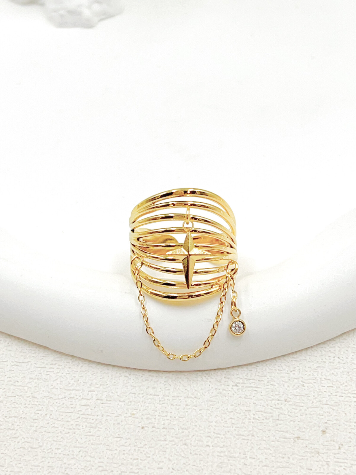 Fais briller ton style avec cette bague réglable ornée d’une étoile stylisée et d’une fine chaînette délicatement suspendue.