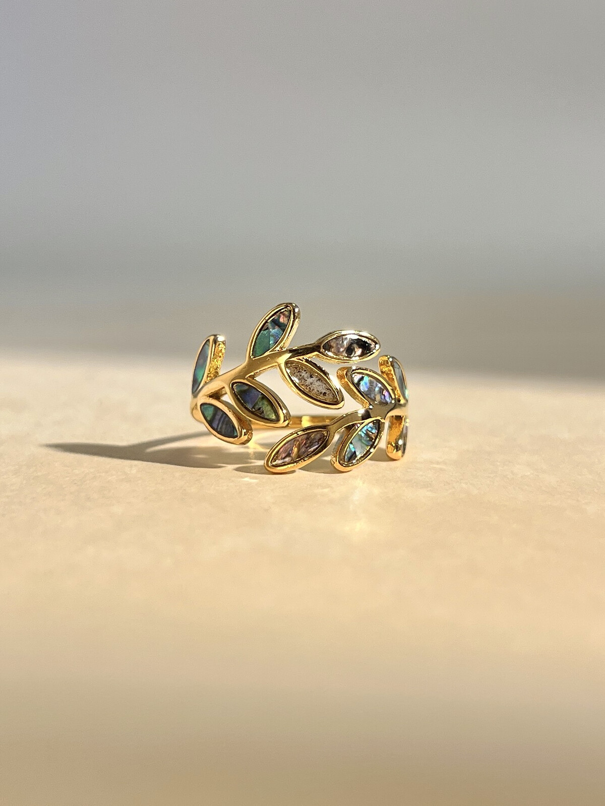 Adopte l’élégance naturelle avec cette bague réglable ornée de feuilles en nacre multicolore aux reflets irisés.