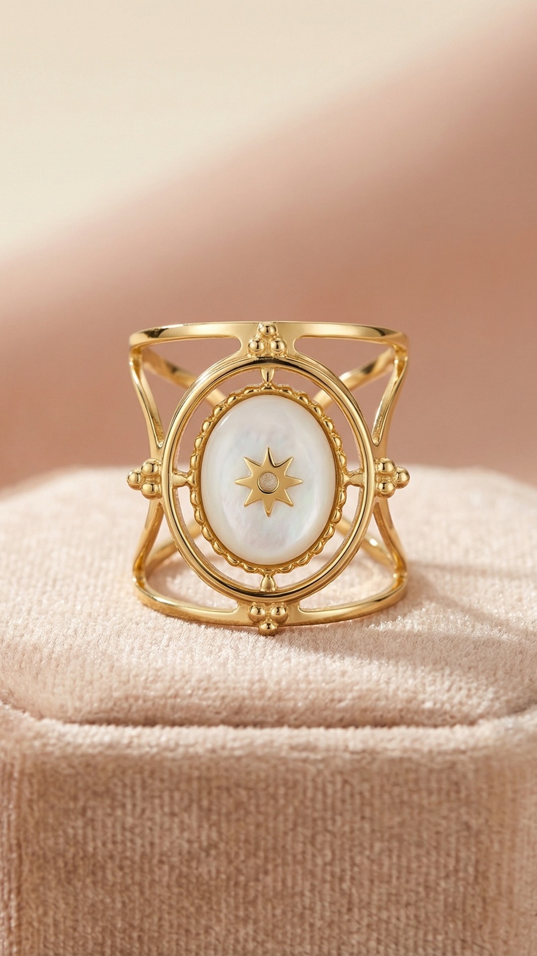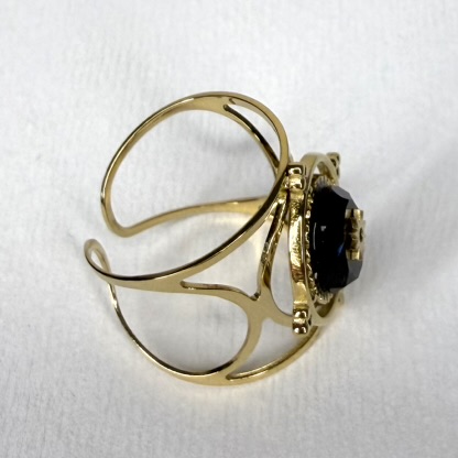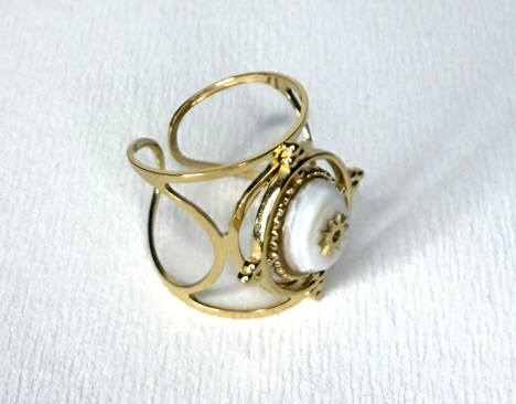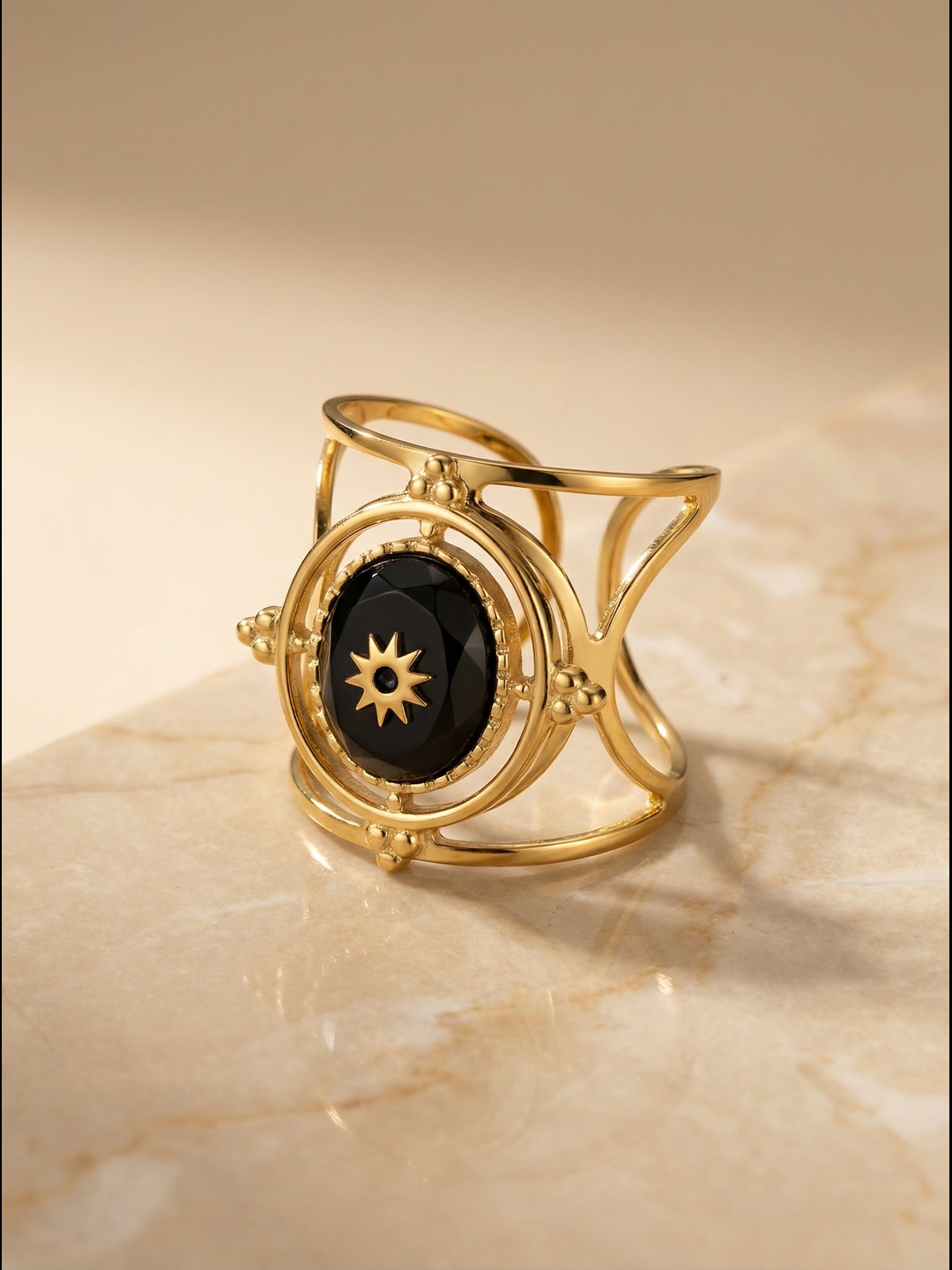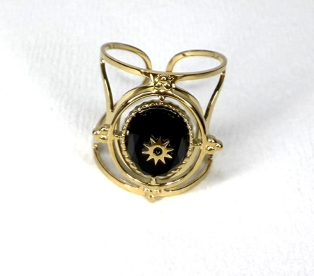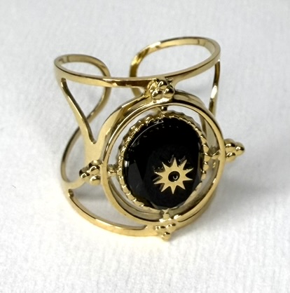 Sublime ton look avec cette bague réglable dorée, ornée d’une pierre ovale (noire ou blanche) mise en valeur par une étoile dorée au centre.