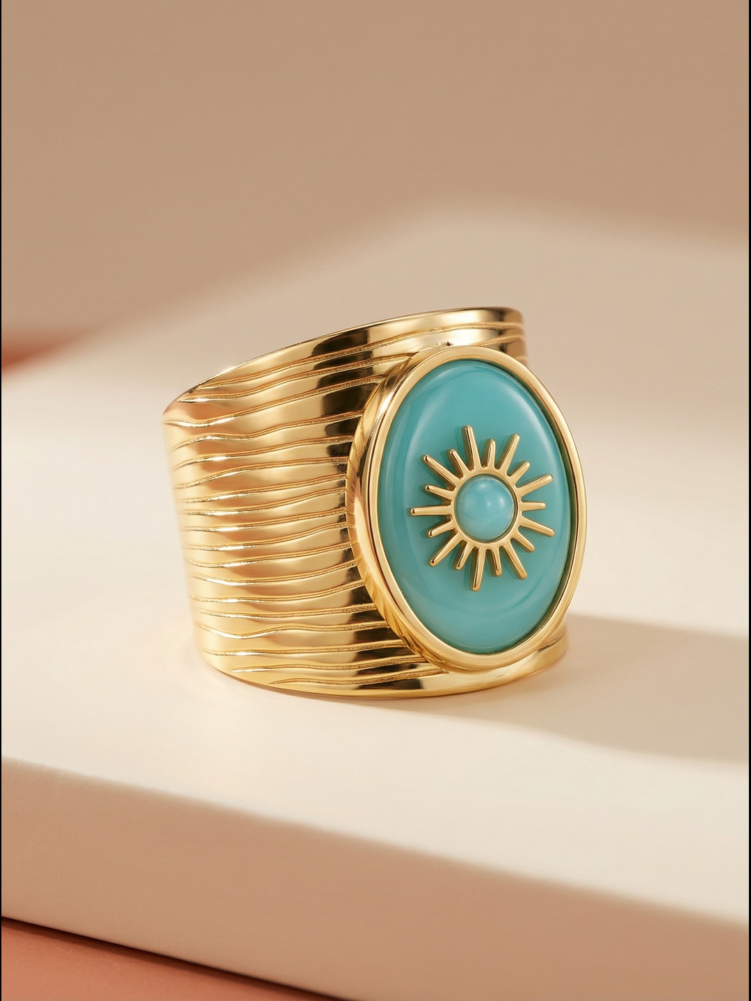 Fais rayonner ton style avec cette bague réglable dorée, sublimée par une pierre ovale verte ornée d’un soleil doré.