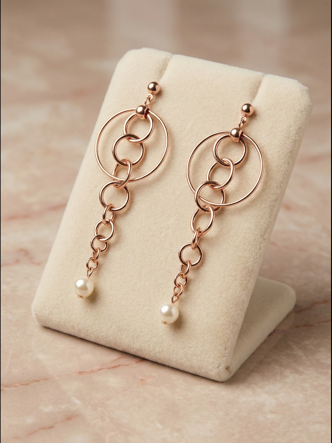Sublime ton allure avec ses boucles d’oreilles pendantes dorées rose, un mélange parfait de modernité et de raffinement.