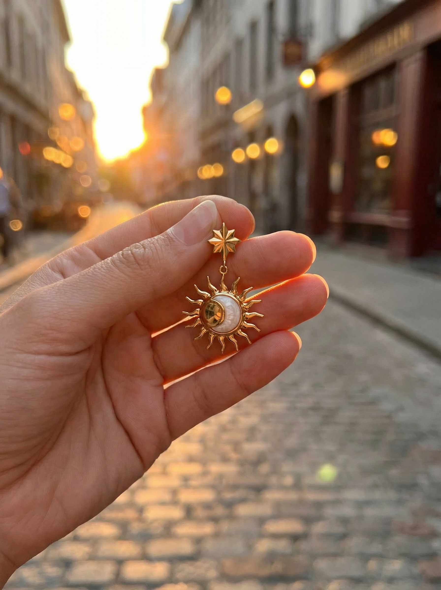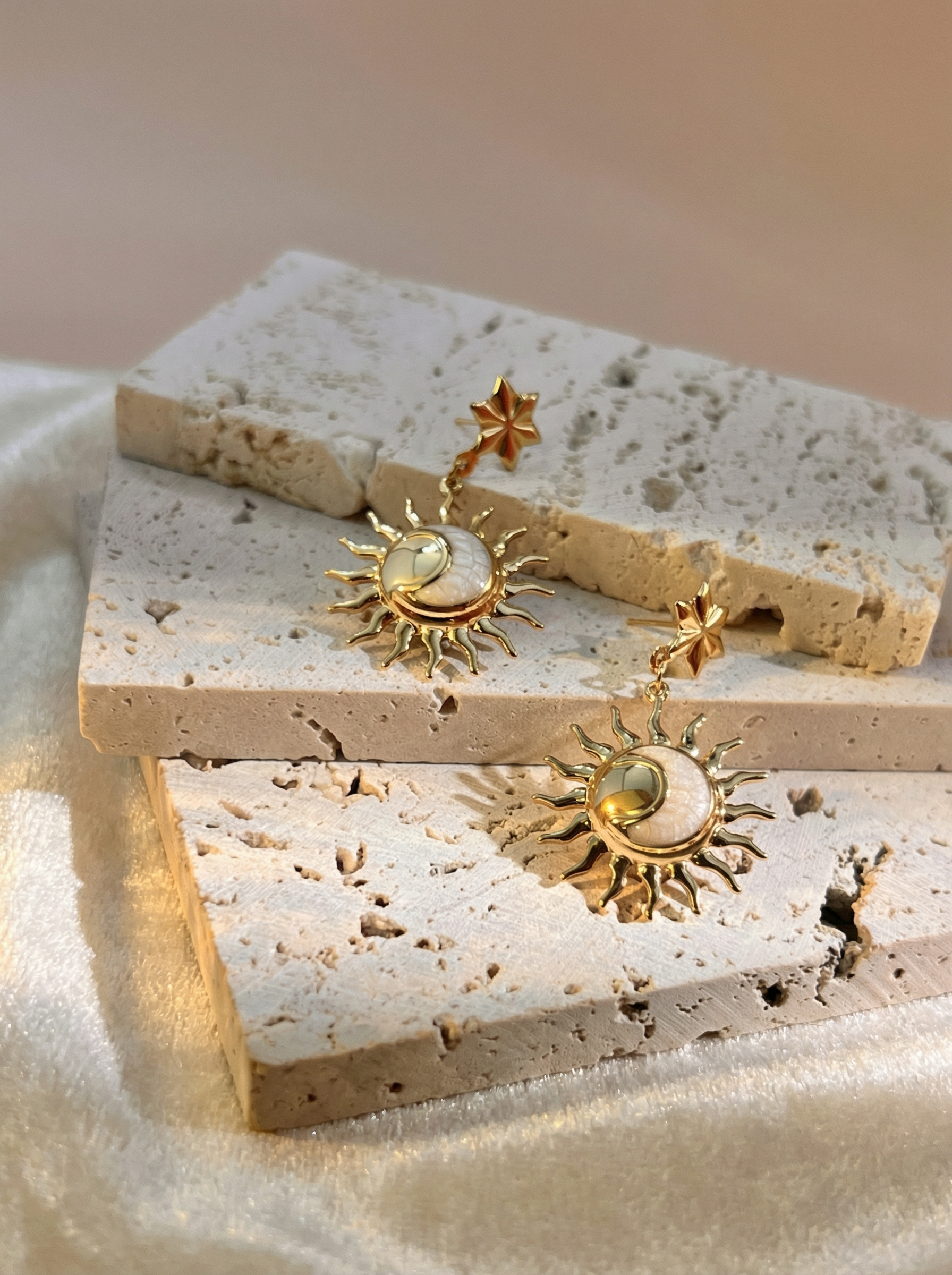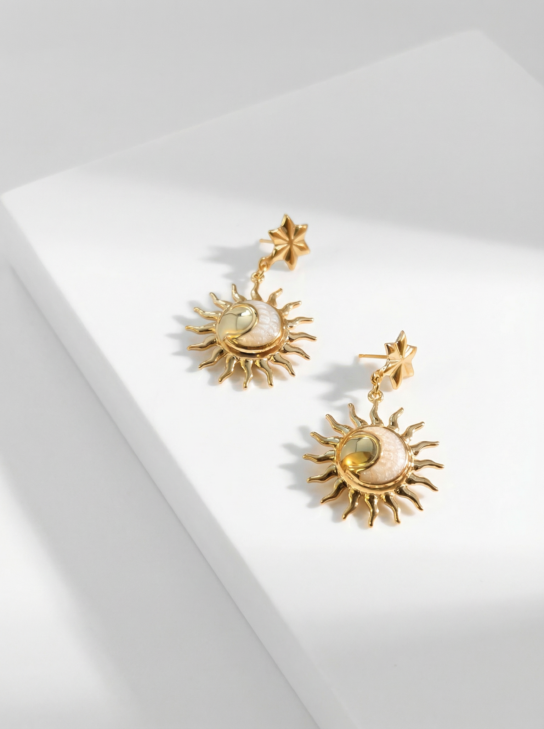 Leur design raffiné mêle l’éclat doré du soleil à la douceur nacrée de la lune, suspendus à de magnifiques étoiles, symbolisant l’harmonie parfaite entre force et sérénité.