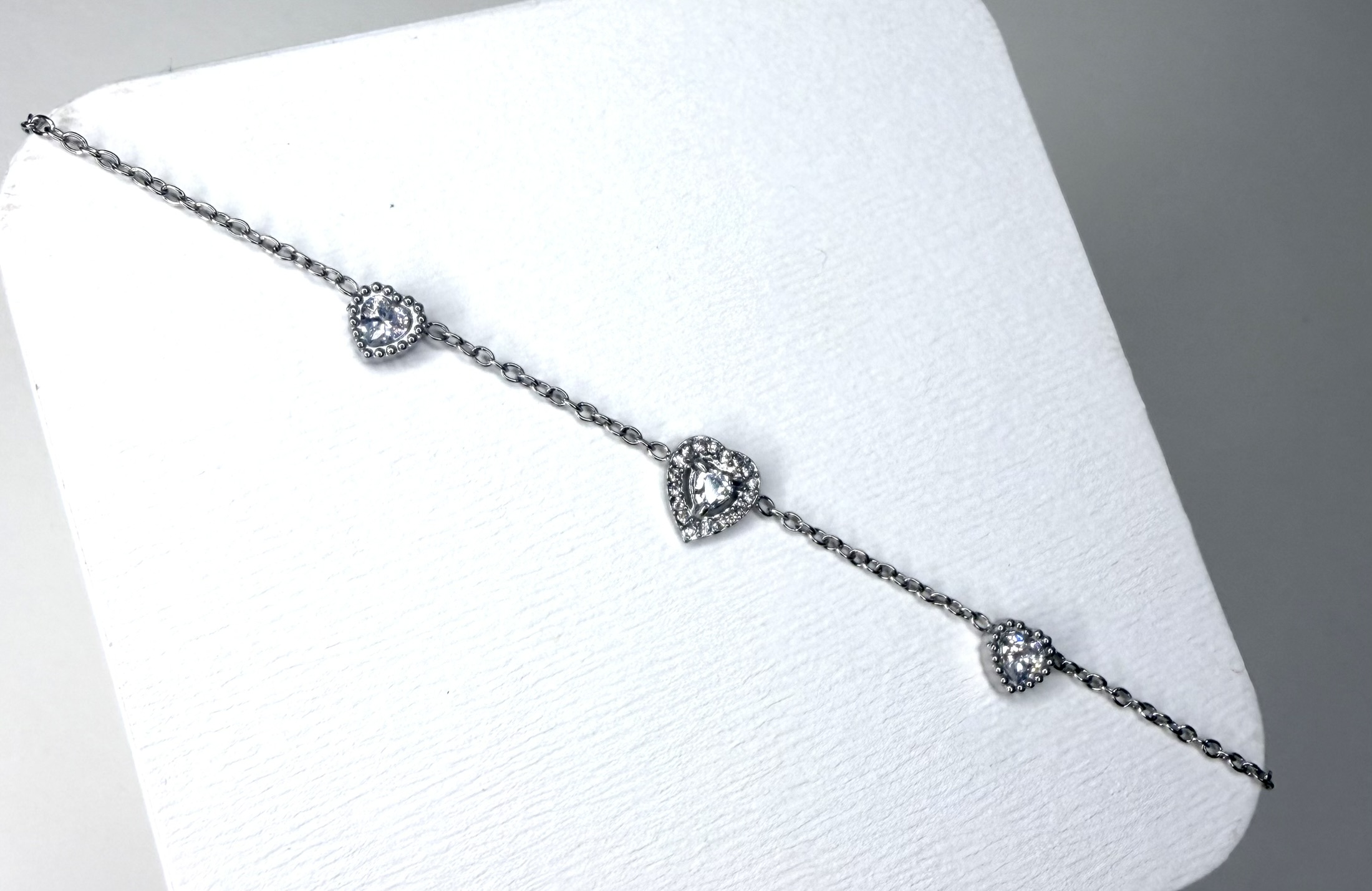 Ajoute une touche romantique et lumineuse à ton poignet avec ce bracelet délicat en acier inoxydable, orné de trois cœurs scintillants en zircon.
