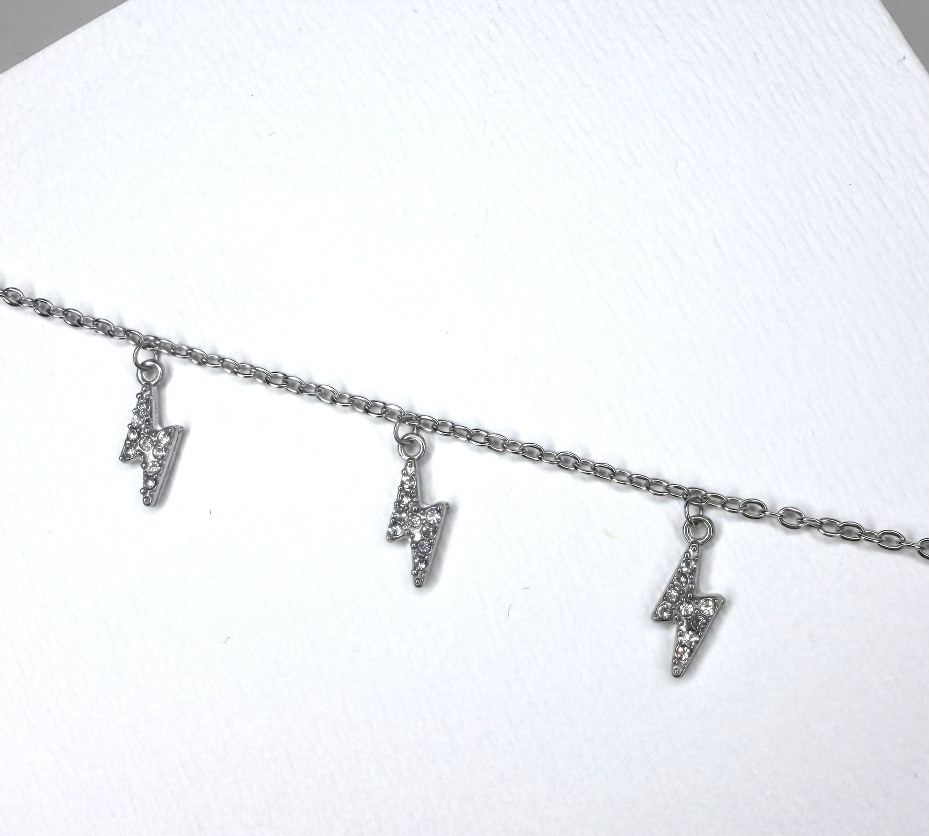 Apporte une touche audacieuse et lumineuse à ton poignet avec ce bracelet argenté orné de pampilles en forme d’éclairs incrustés de strass.