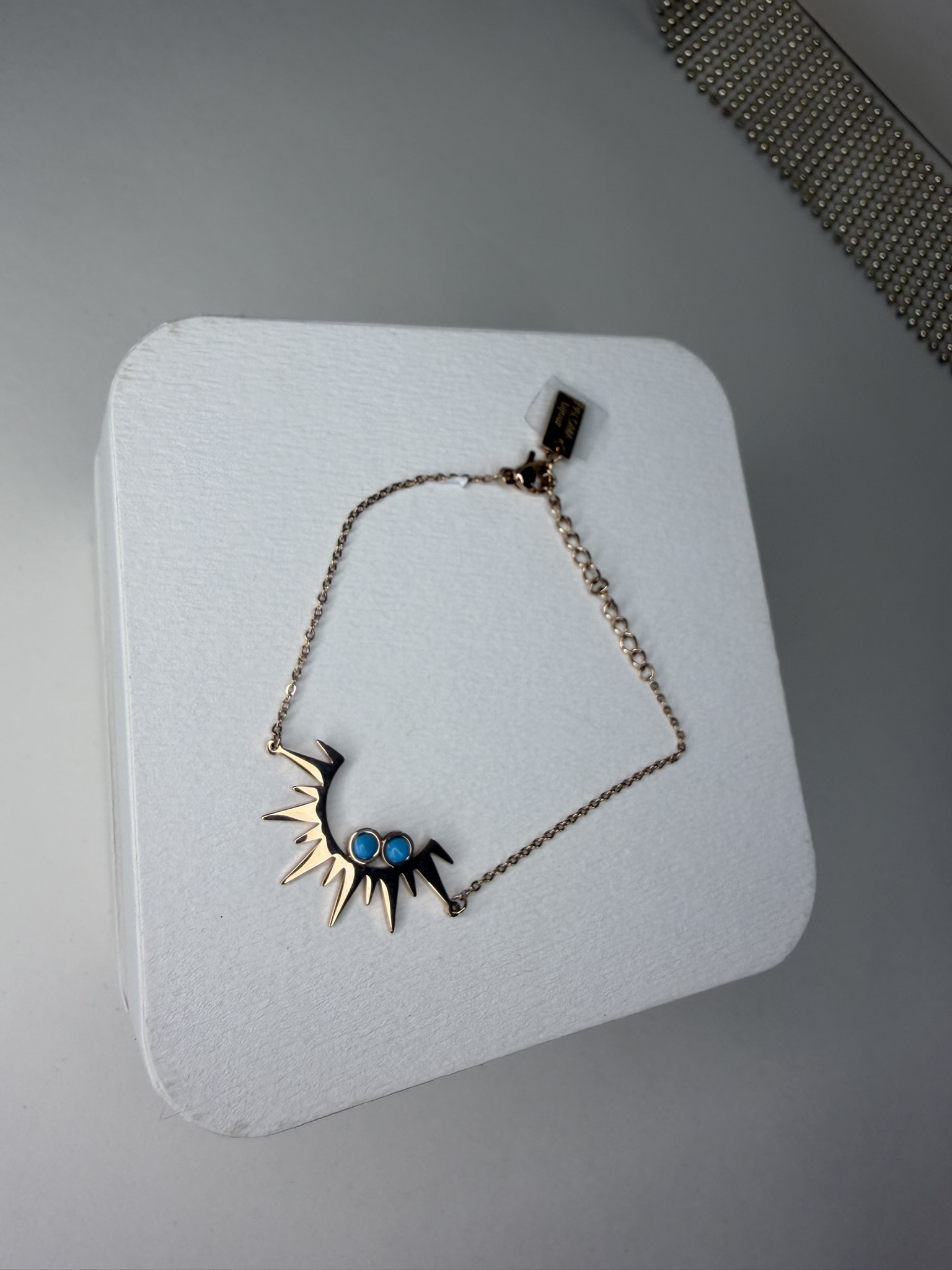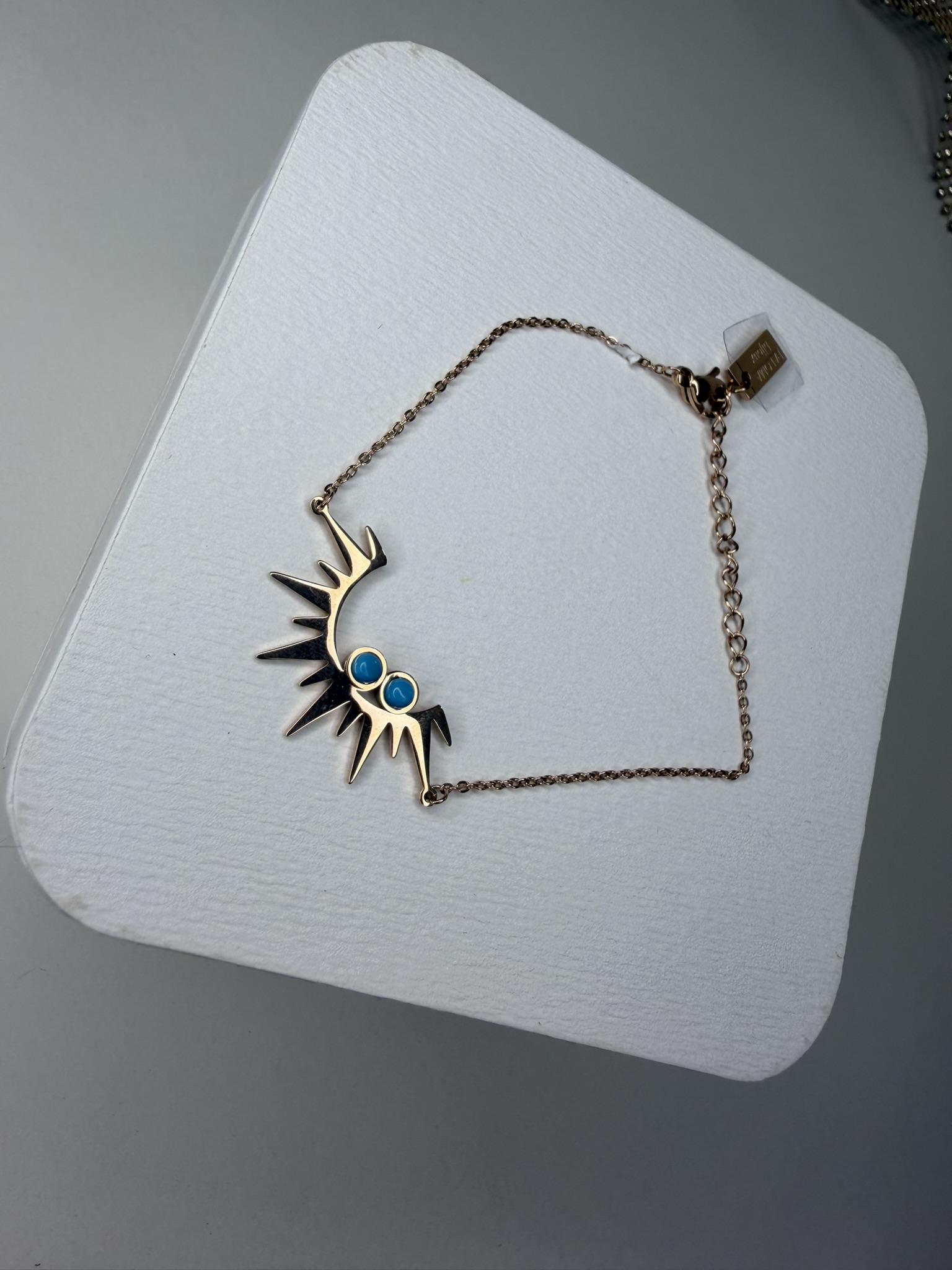 Affirme ton style avec ce bracelet doré rose au design solaire, orné de deux pierres turquoise symbolisant la protection et la sérénité.