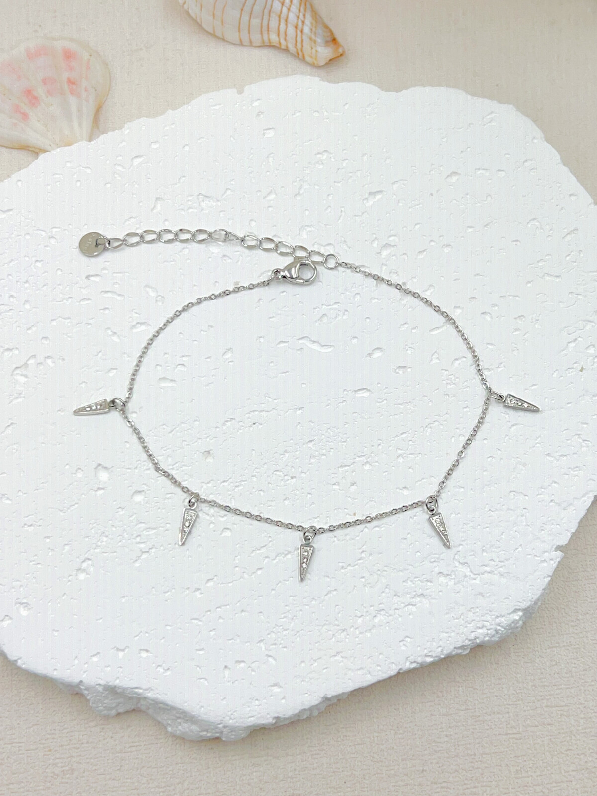 Affirme ton style avec cette chaîne de cheville argentée ornée de pampilles pointes strassées, un bijou moderne et élégant qui sublime la cheville avec discrétion et éclat.