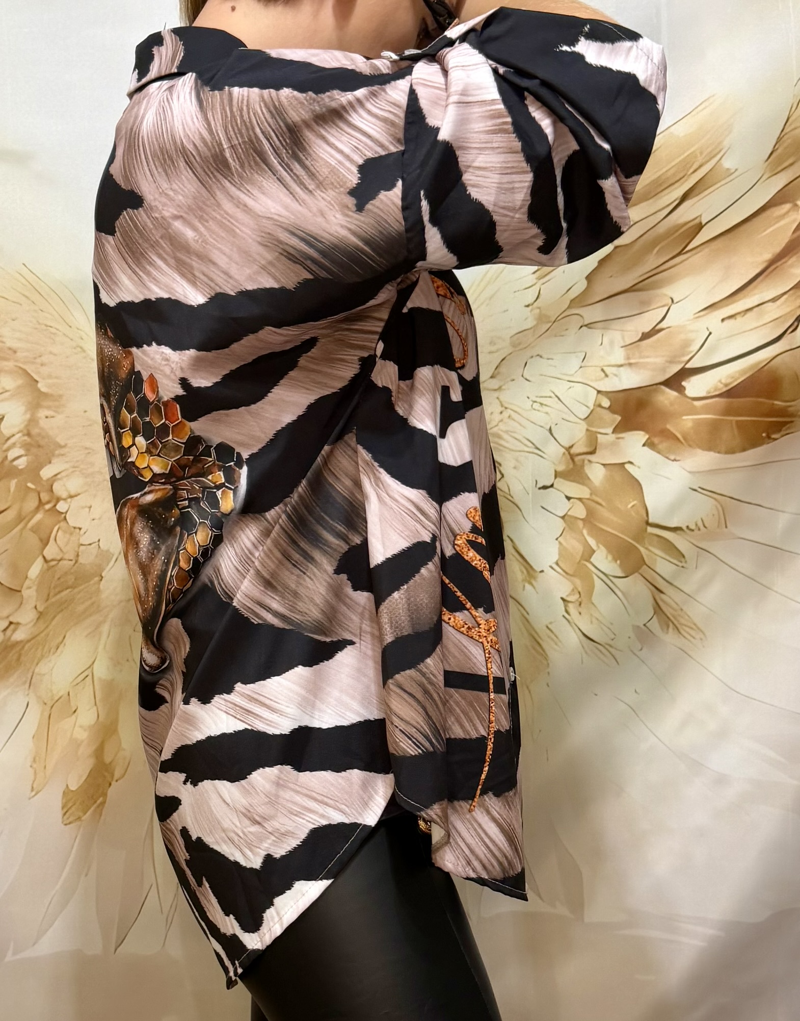 Ses manches retroussées apportent une touche décontractée et moderne, tandis que son imprimé original mélange sensualité et esprit sauvage.