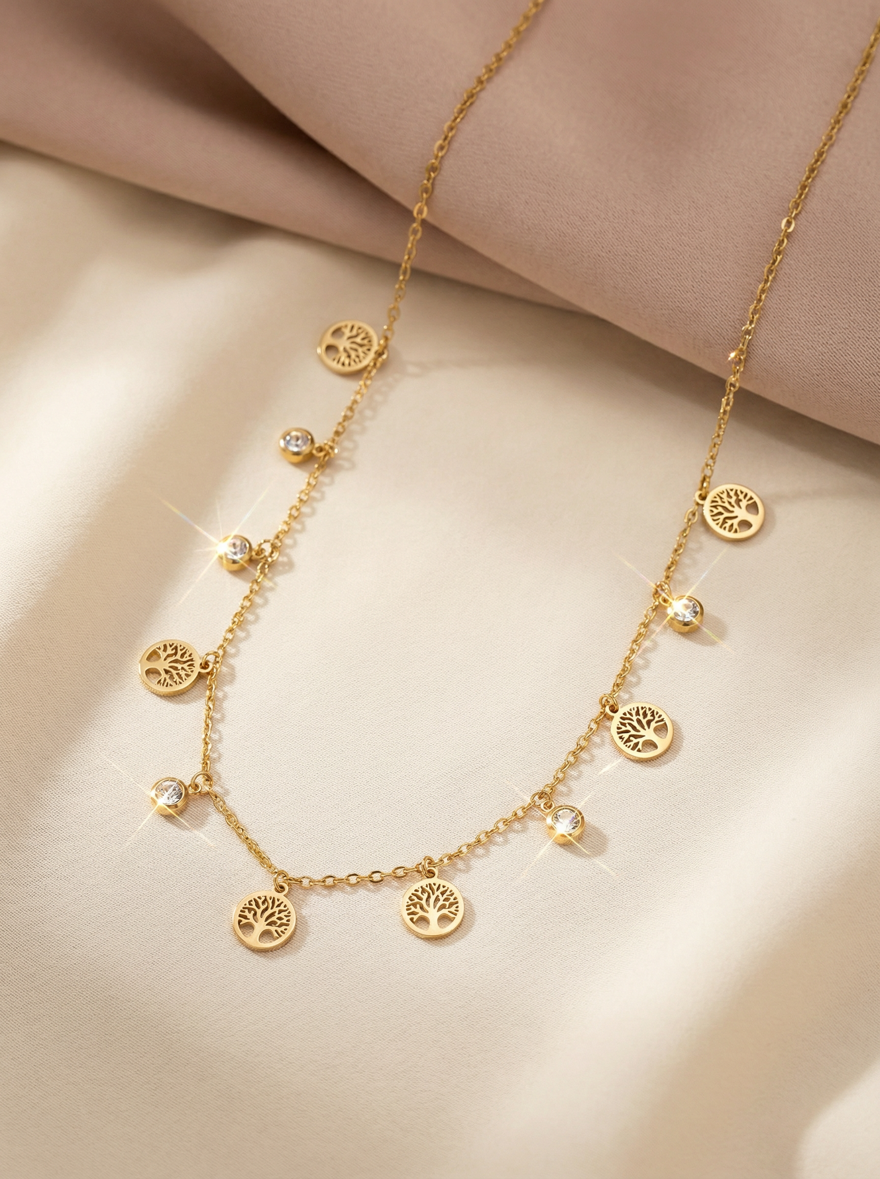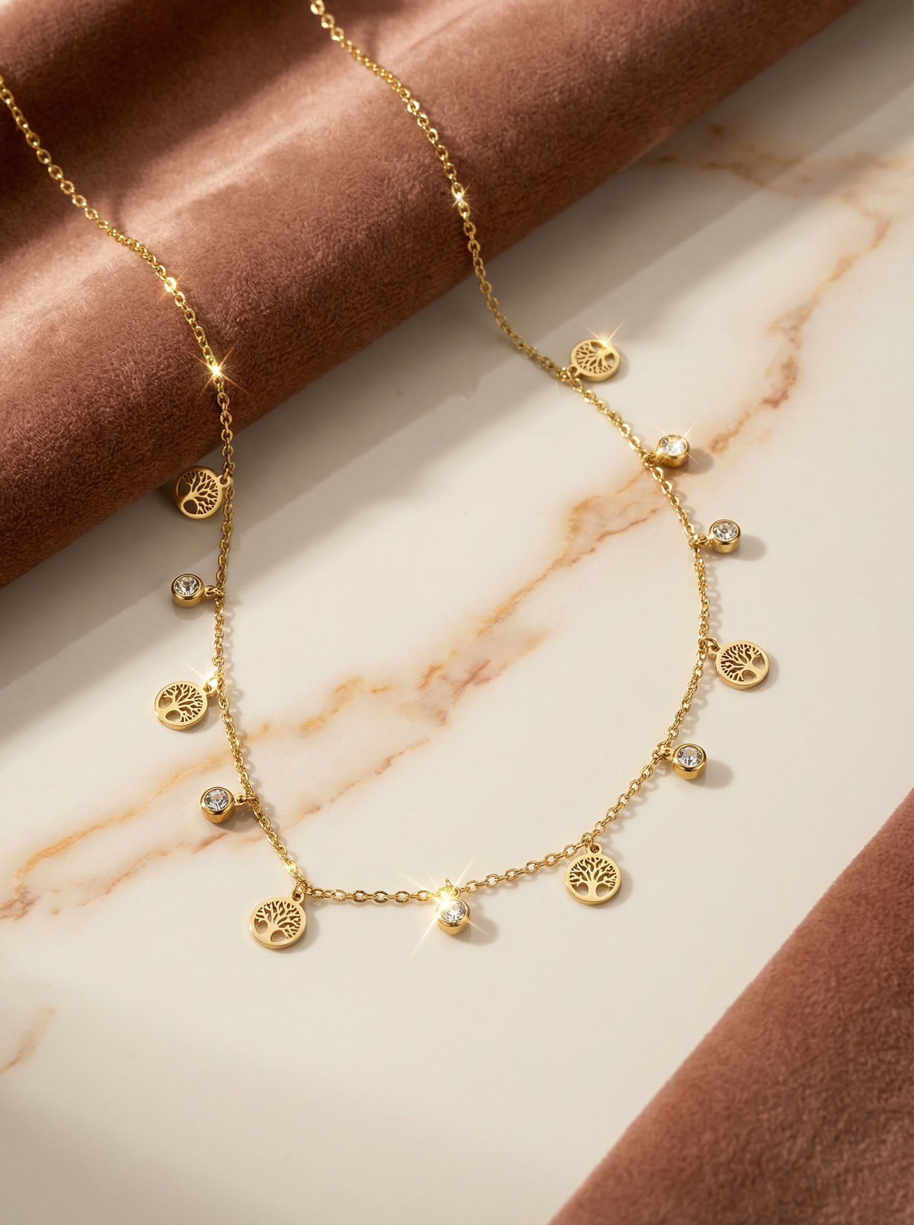Illumine ton décolleté avec ce collier doré symbolique qui associe les breloques arbre de vie à des strass scintillants sur un acier inoxydable résistant.