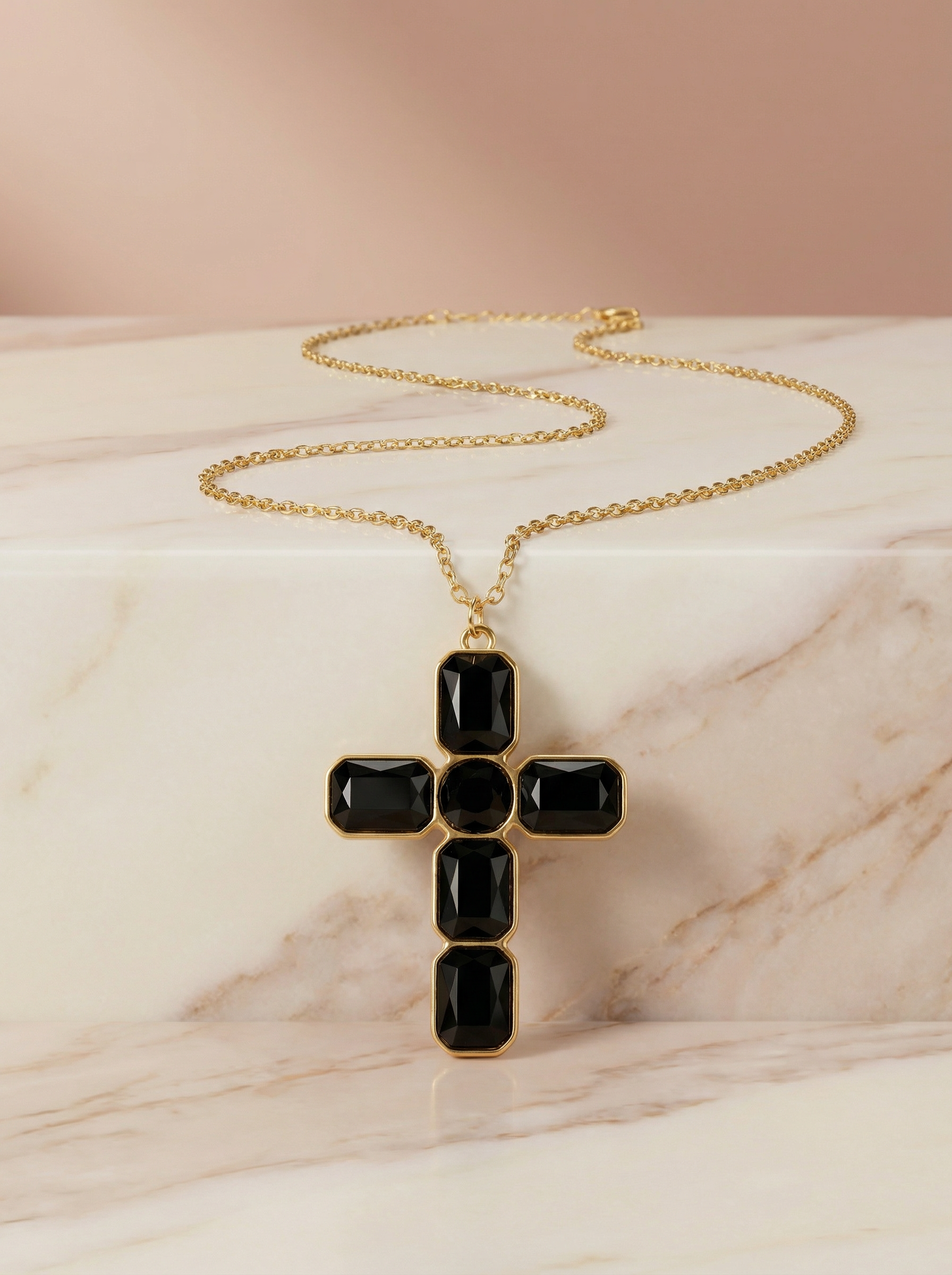 Sublime ton décolleté avec ce superbe collier doré orné d’une croix sertie de cristaux étincelants.