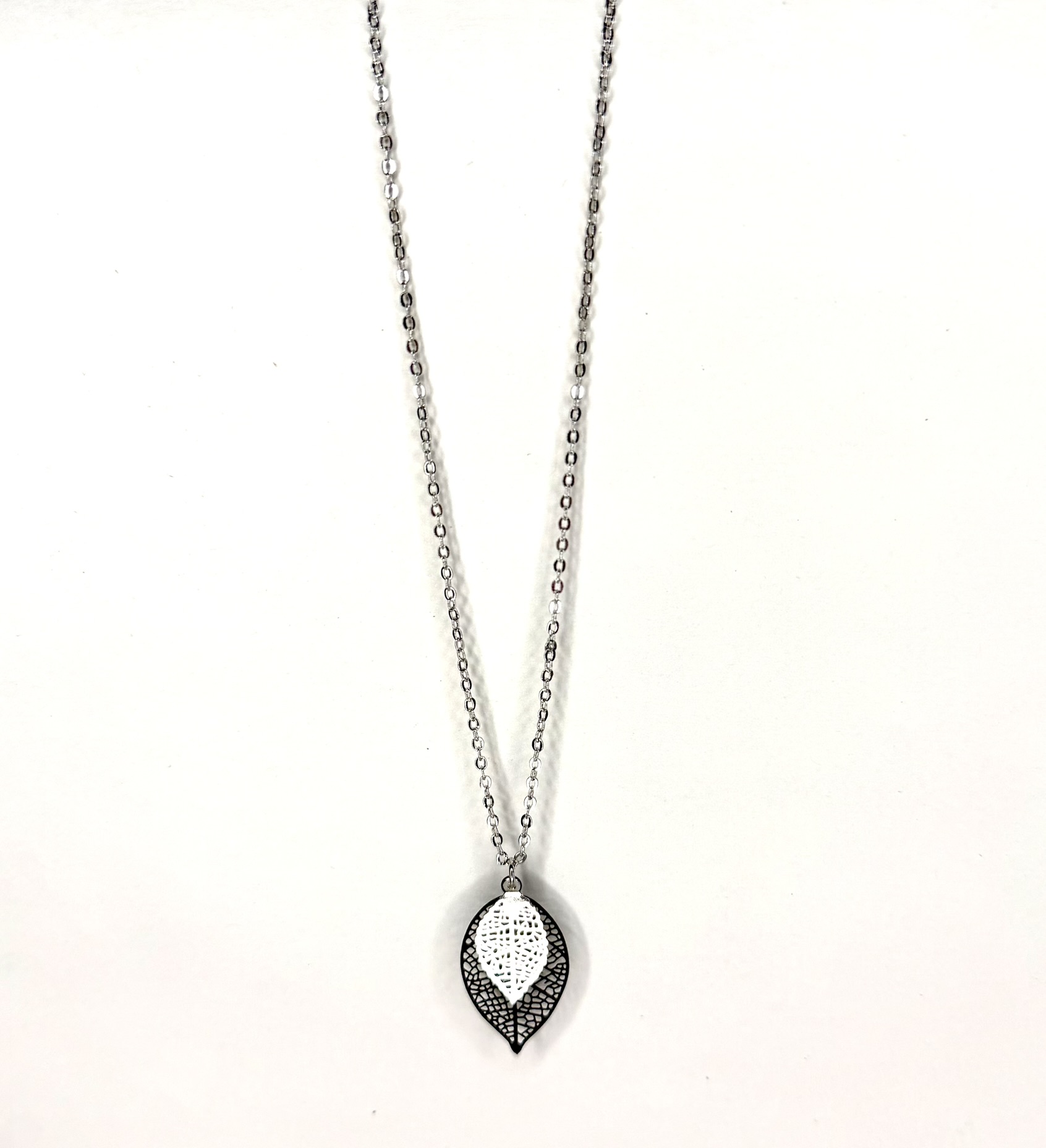 Apporte une touche de délicatesse à ton style avec ce collier argenté orné d’un pendentif feuilles ajourées noire et argentée.