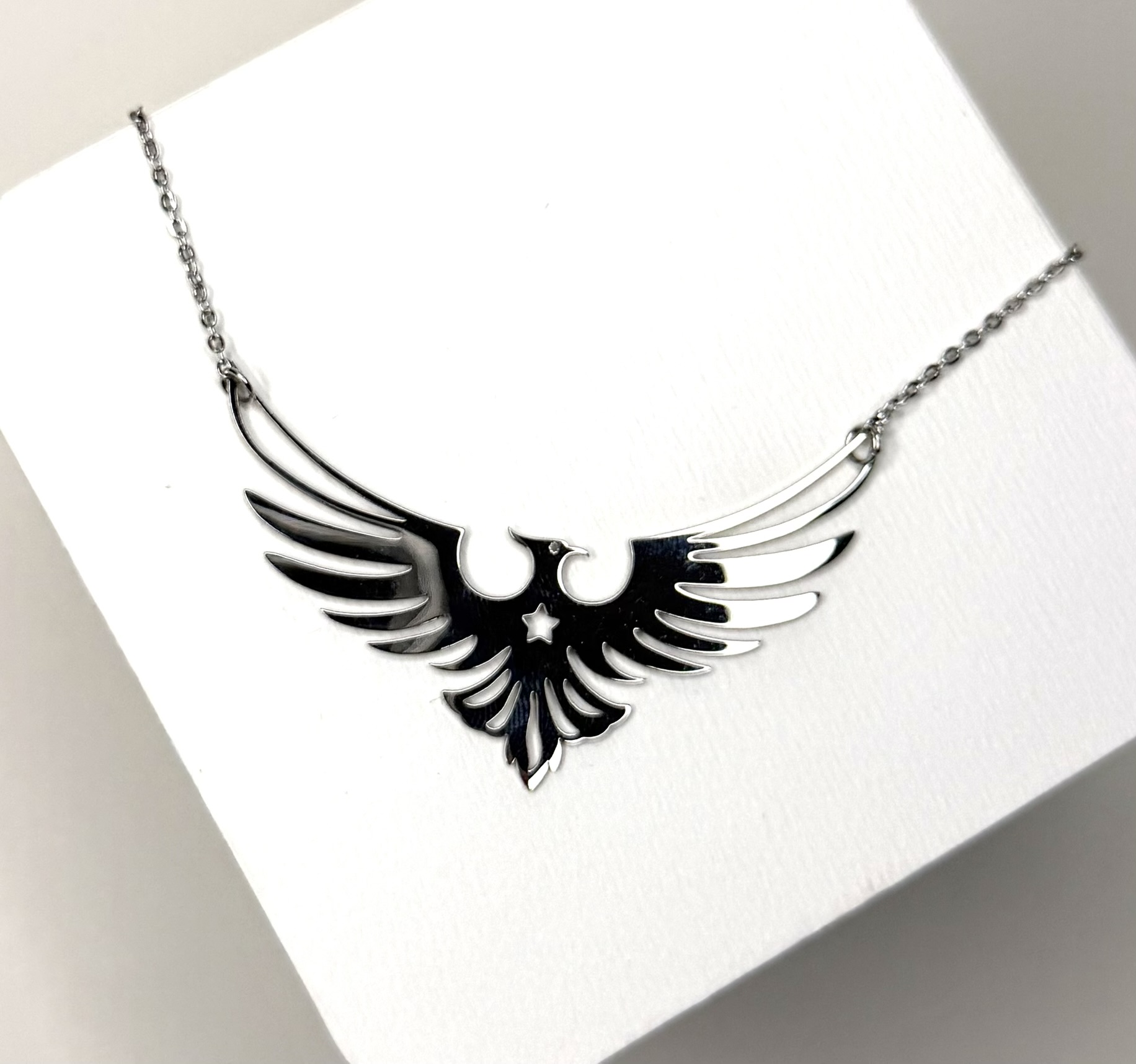 Son pendentif finement travaillé représente l’oiseau légendaire aux ailes déployées, évoquant la résilience et la beauté intérieure.