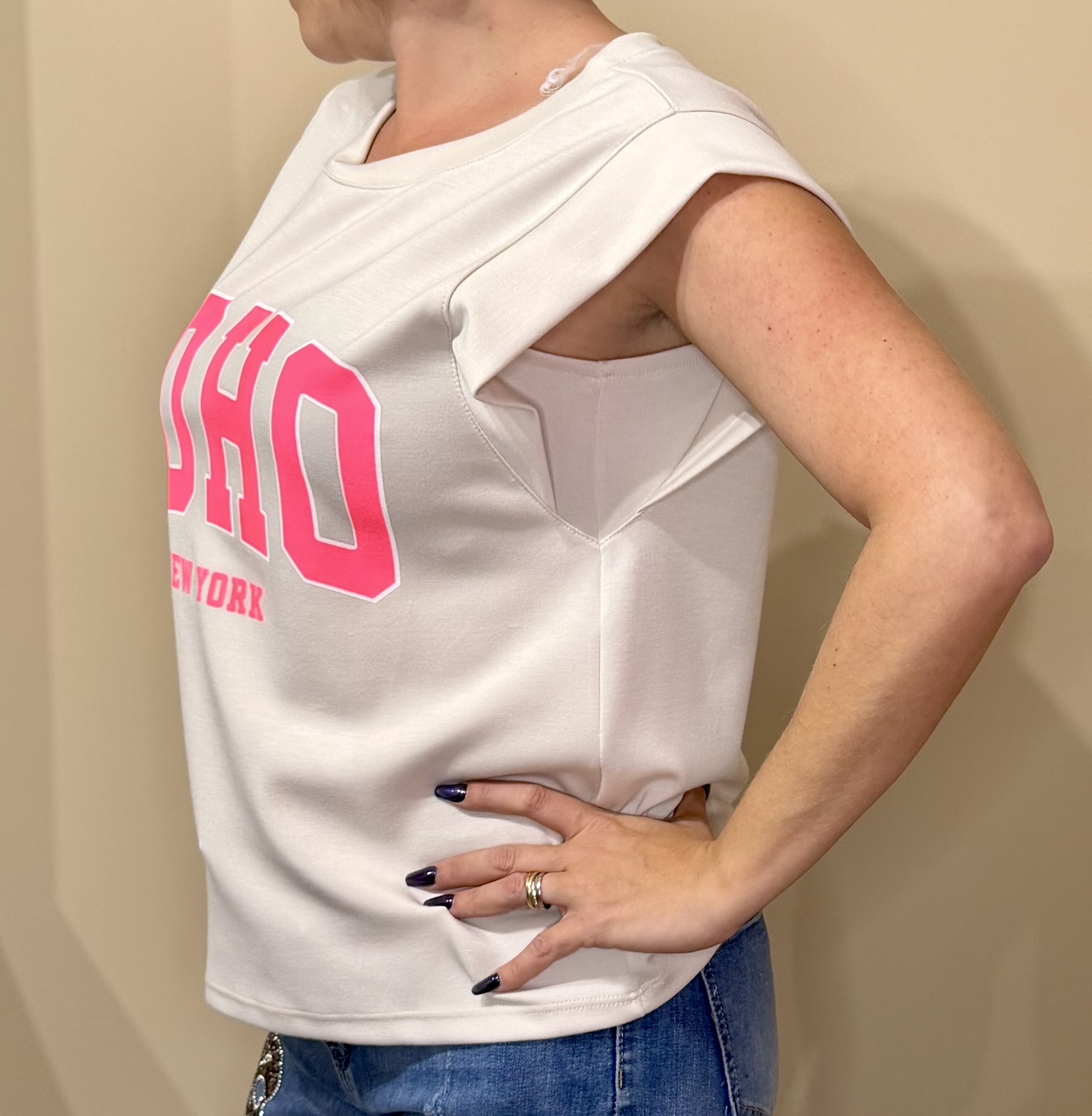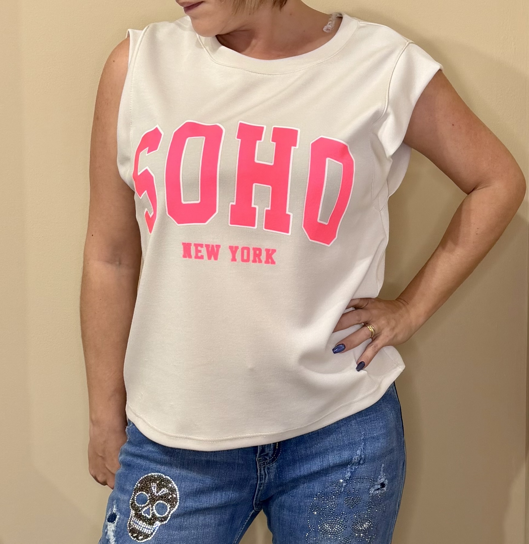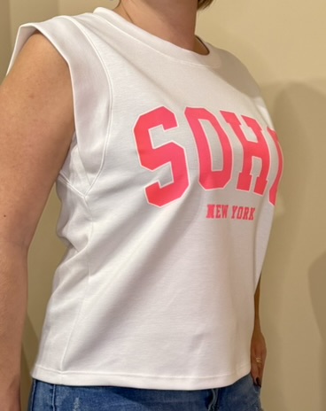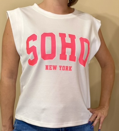 Craquez pour ce débardeur tendance au style urbain ultra-moderne, orné du célèbre print SOHO – New York dans un rose néon éclatant.