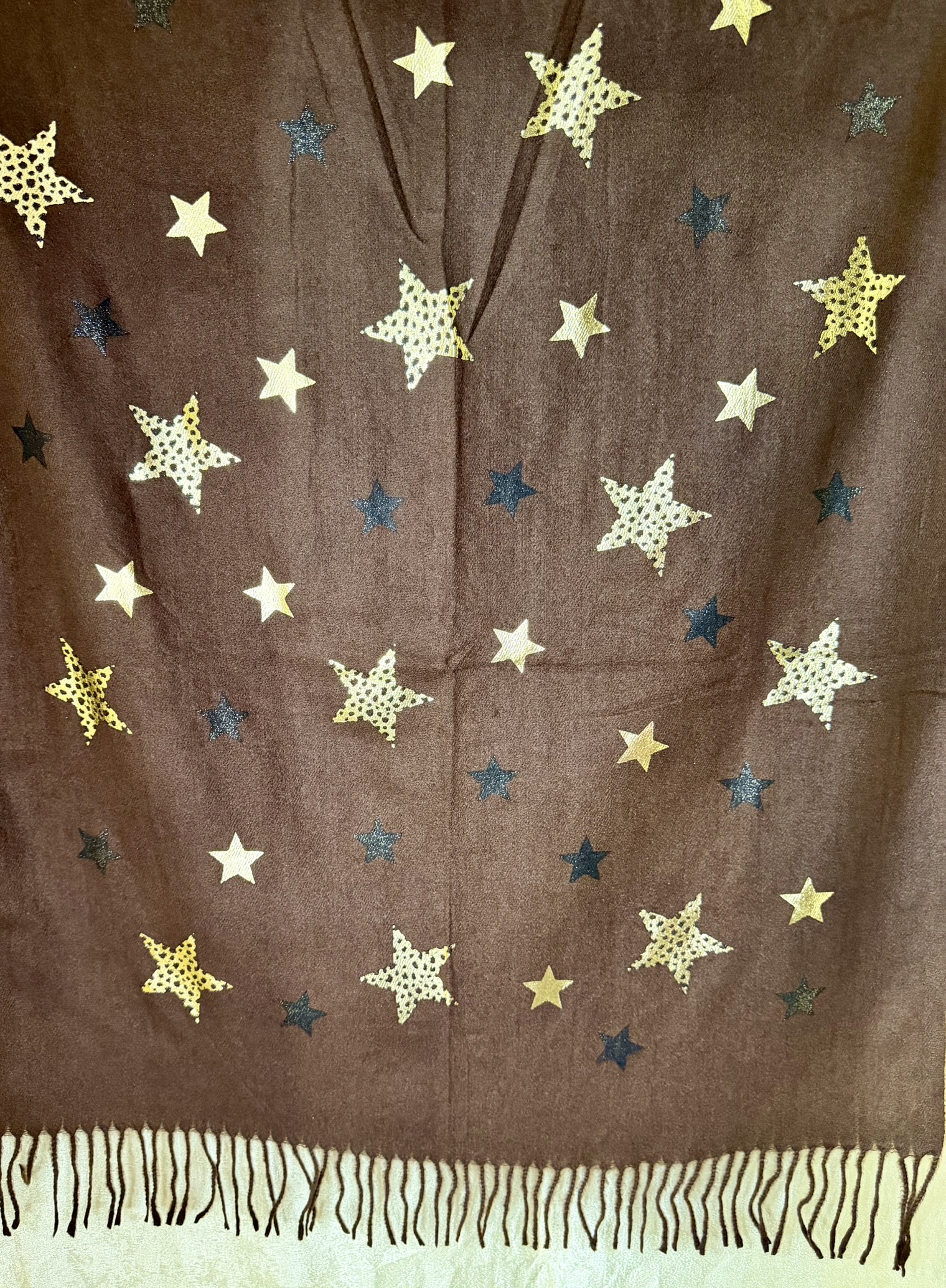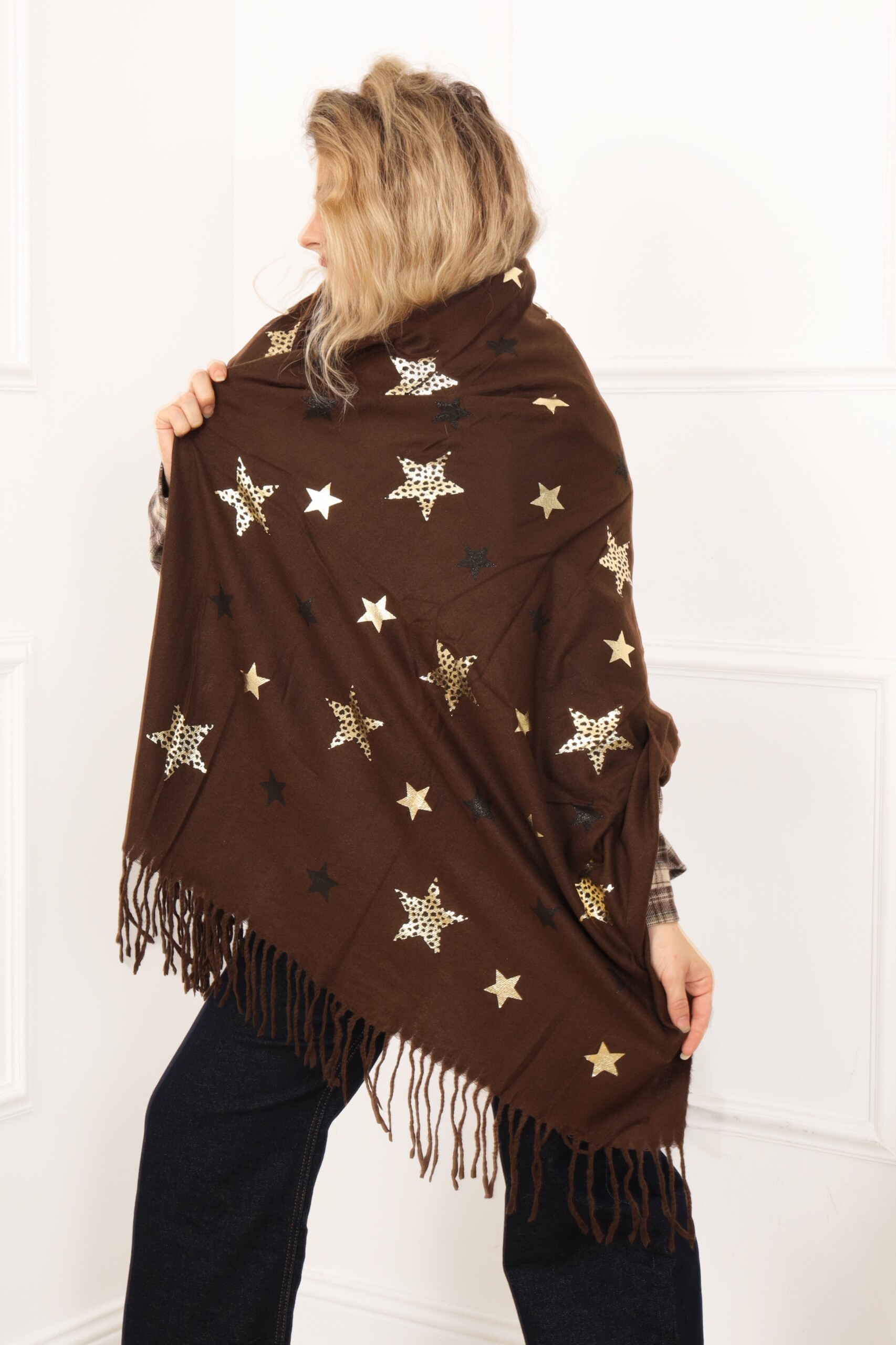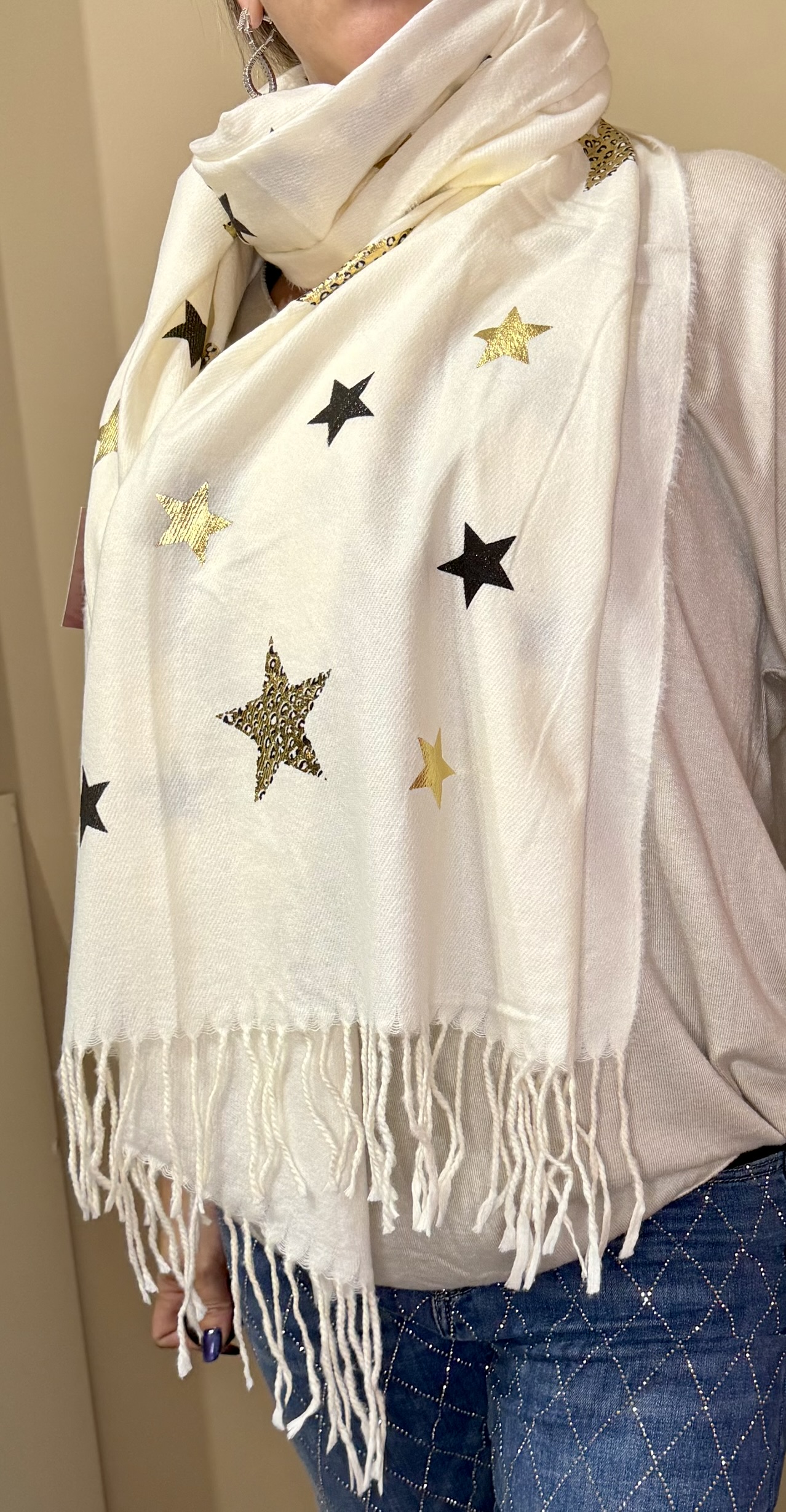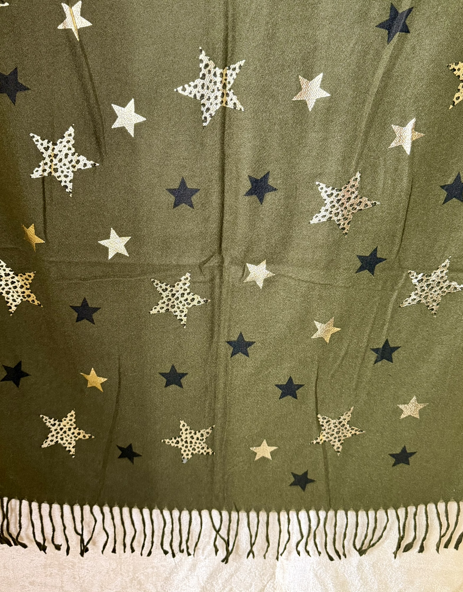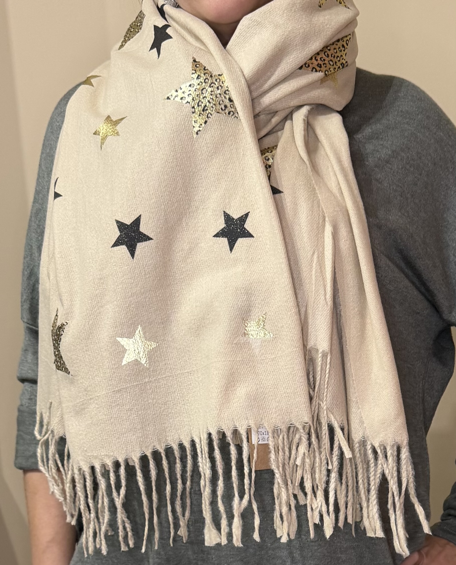 Avec ses finitions frangées et son motif original mêlant étoiles dorées, noires et imprimées, elle est parfaite pour réchauffer tes tenues d’hiver avec une touche de fantaisie élégante.