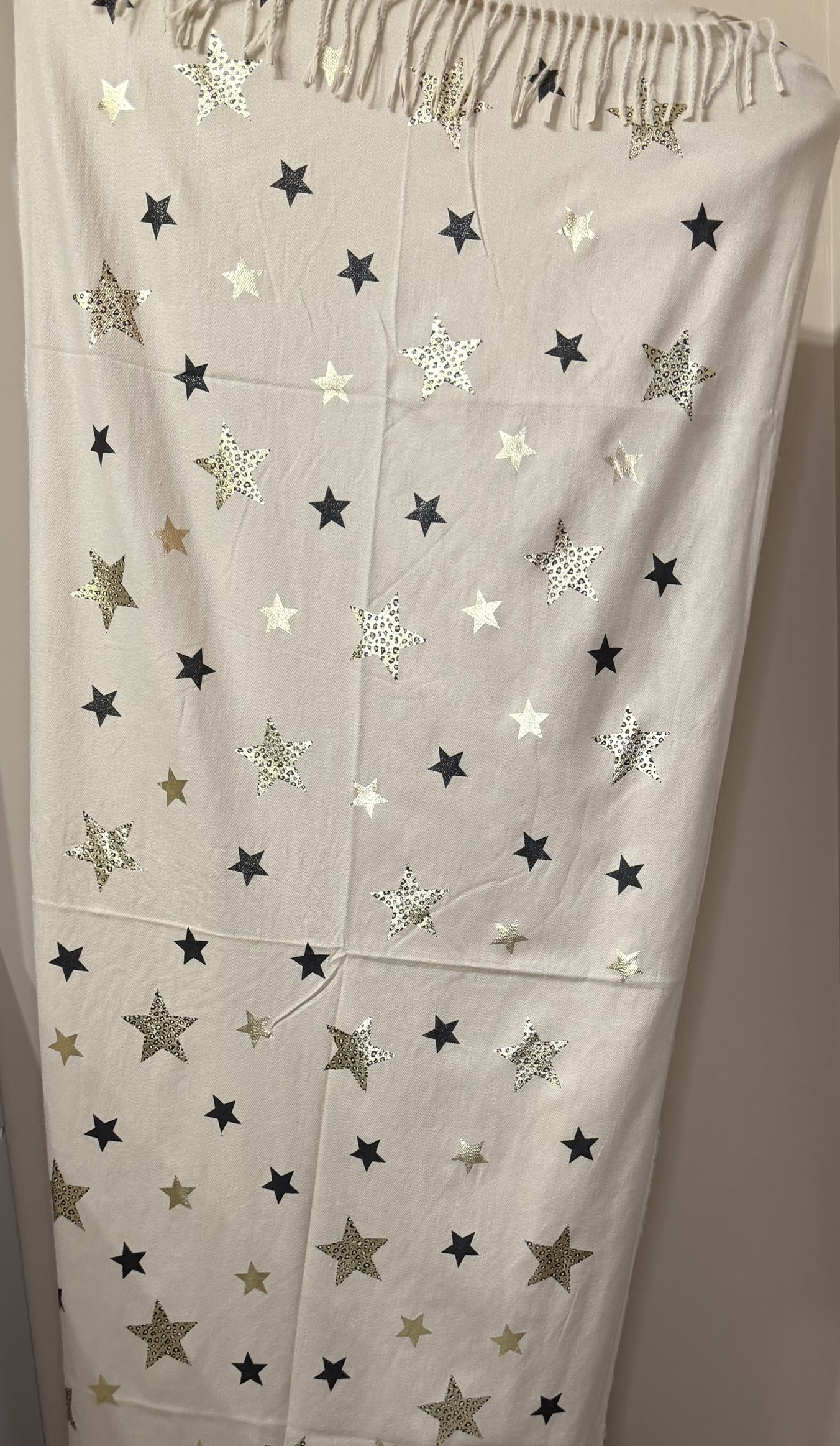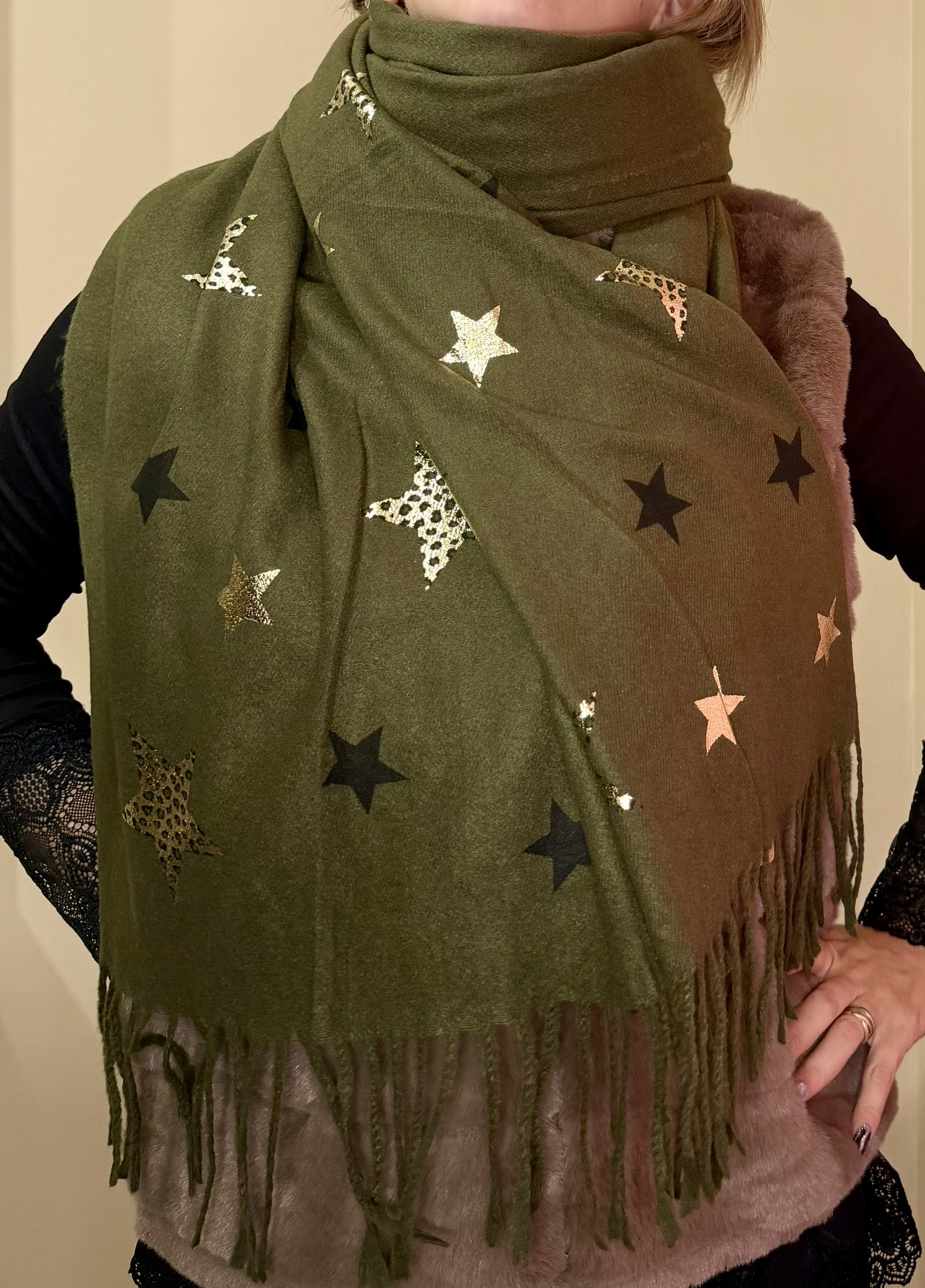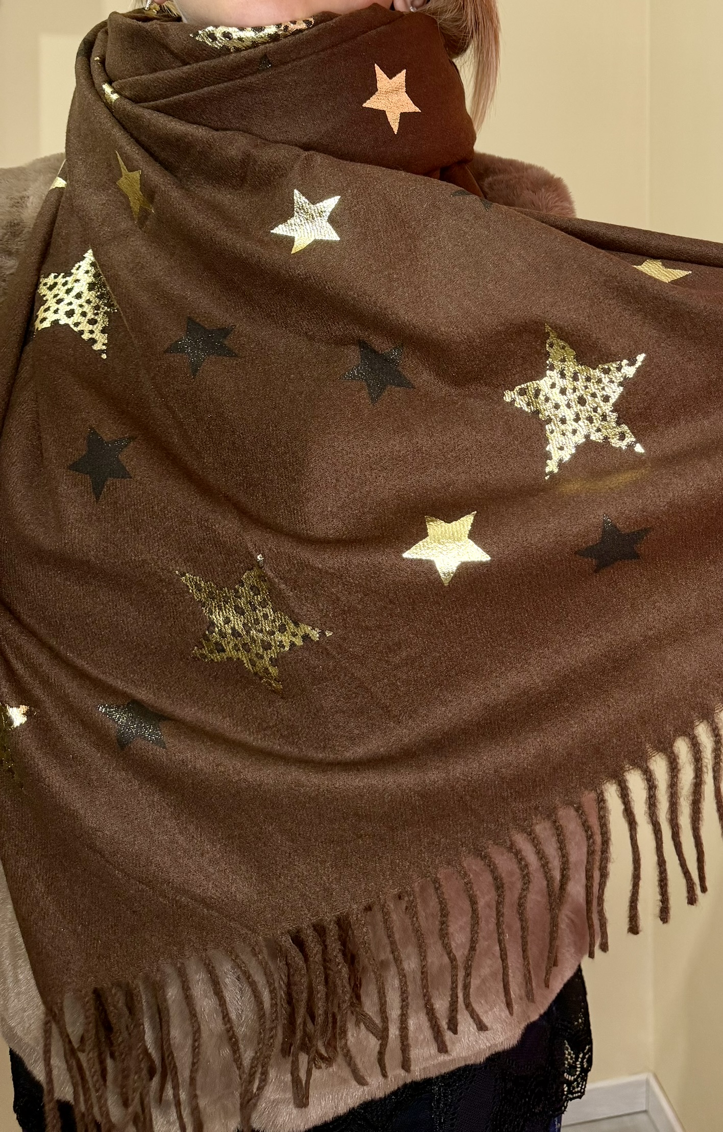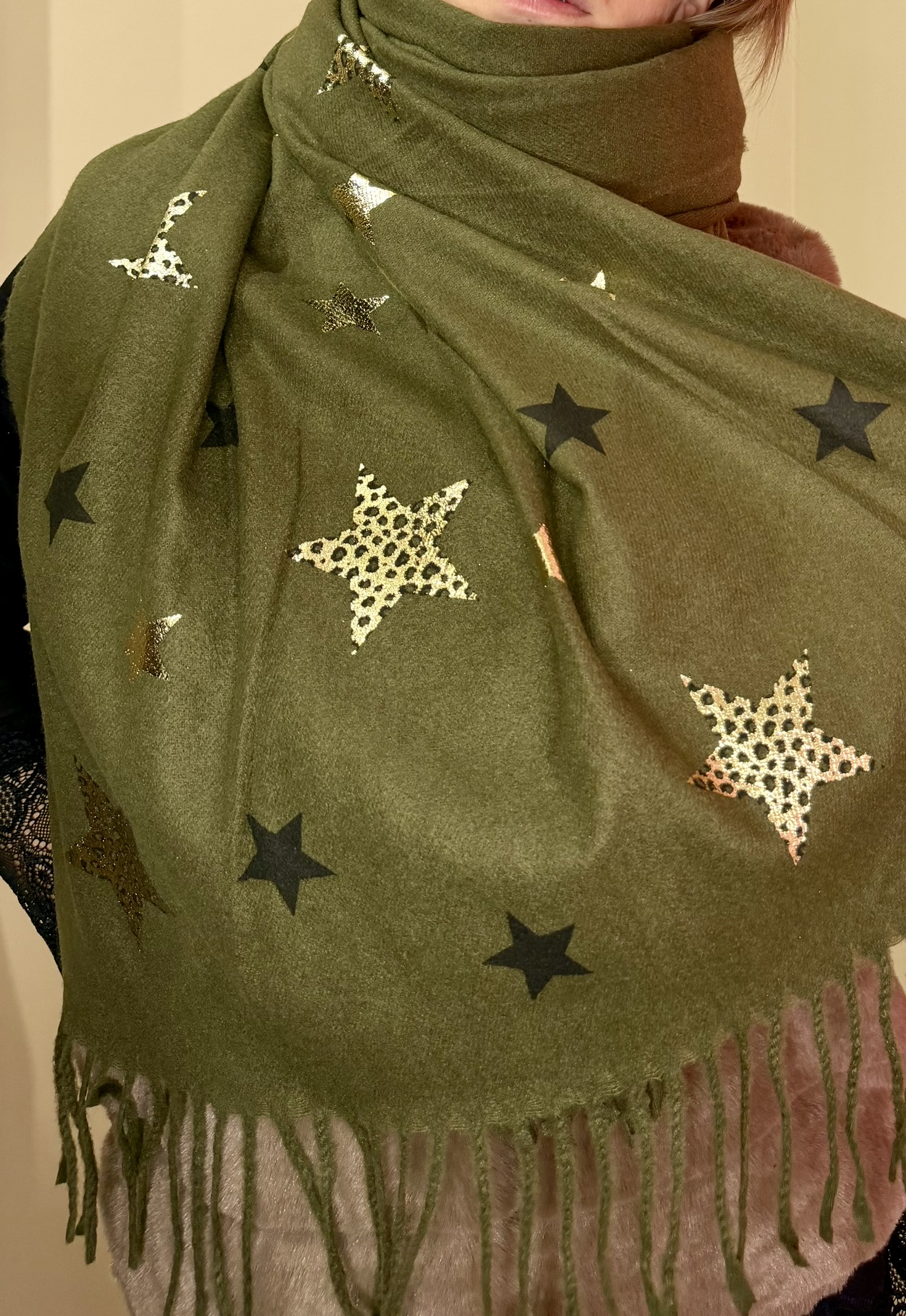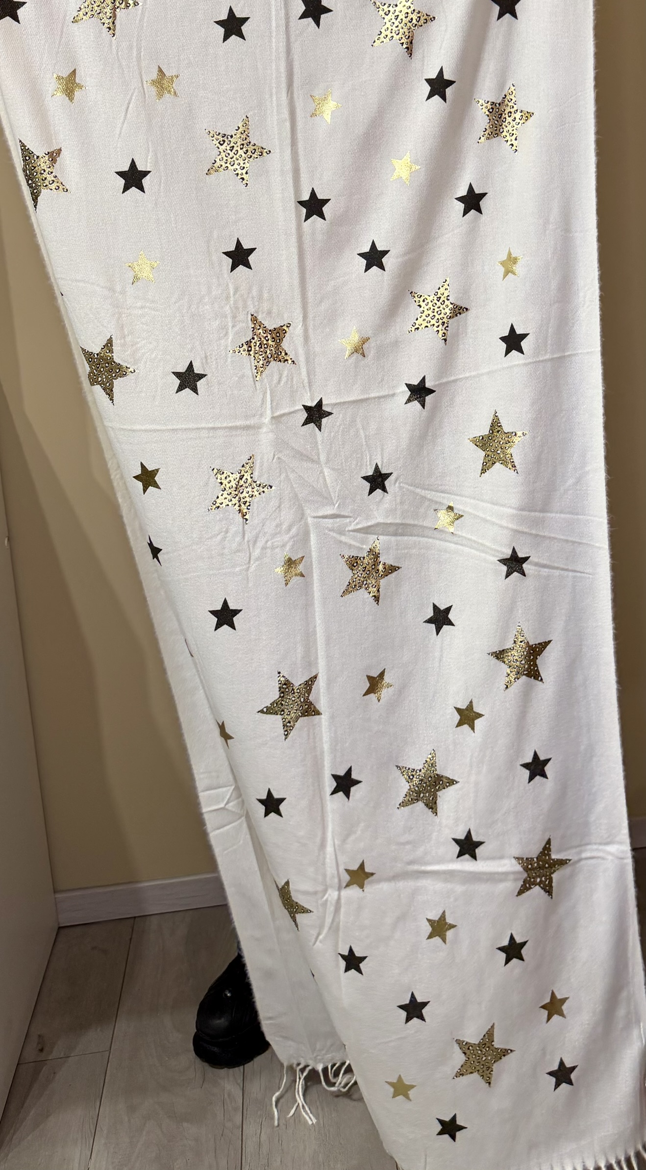 Prépare-toi à briller avec cette écharpe douce et chaude ornée de jolies étoiles dorées ! Son motif scintillant illumine ton look en un clin d’œil, tout en t’enveloppant de confort.