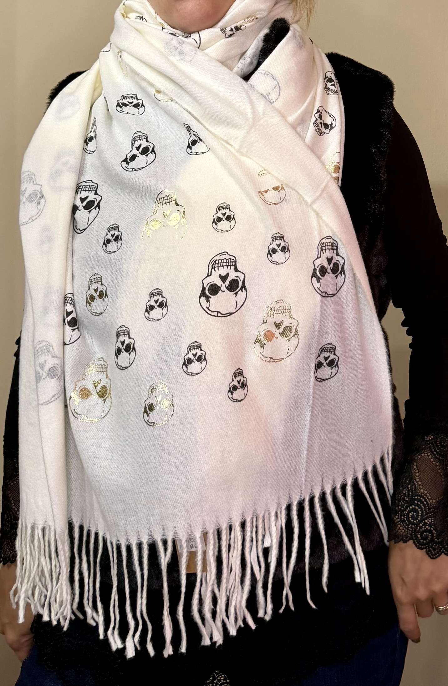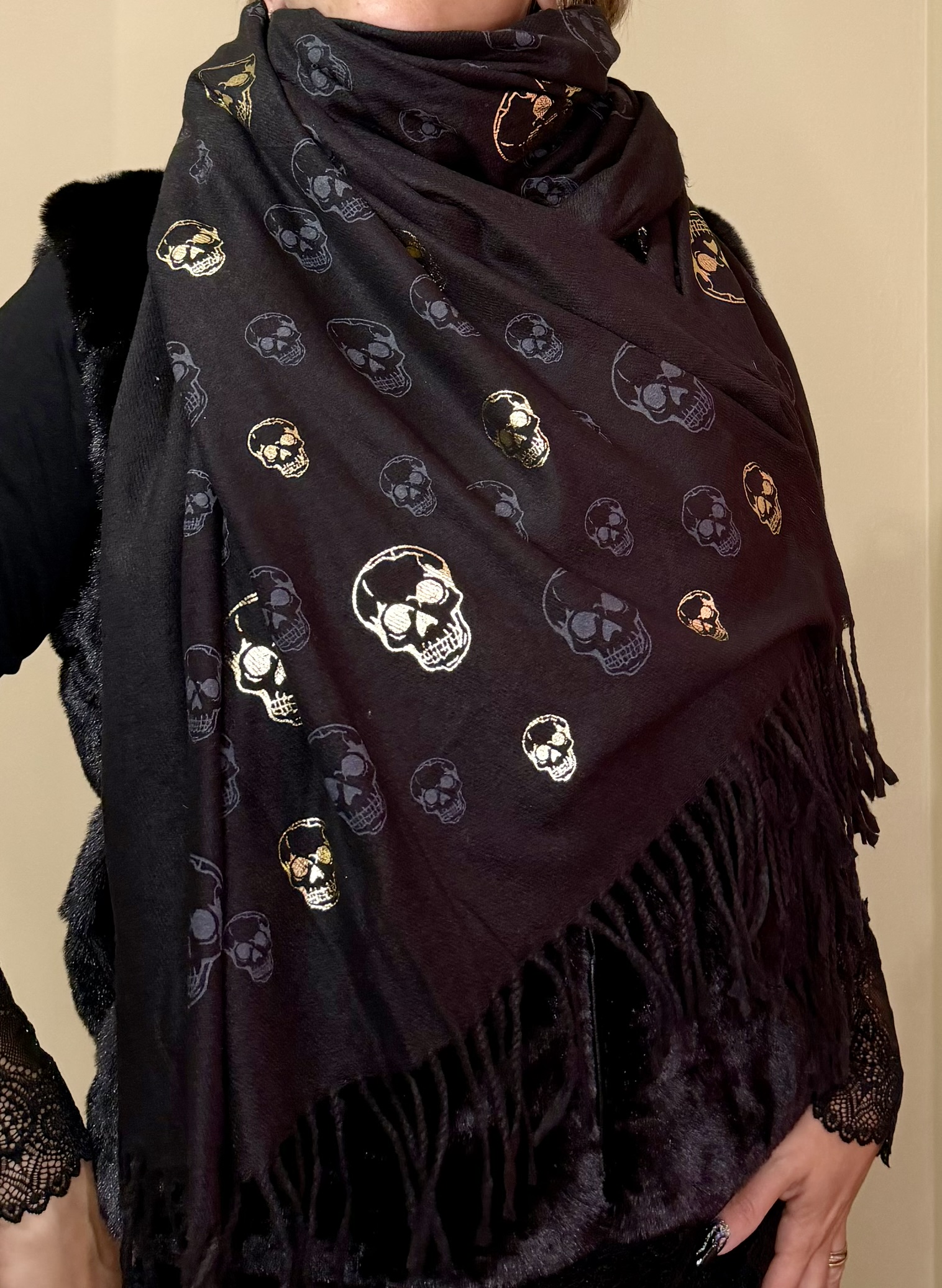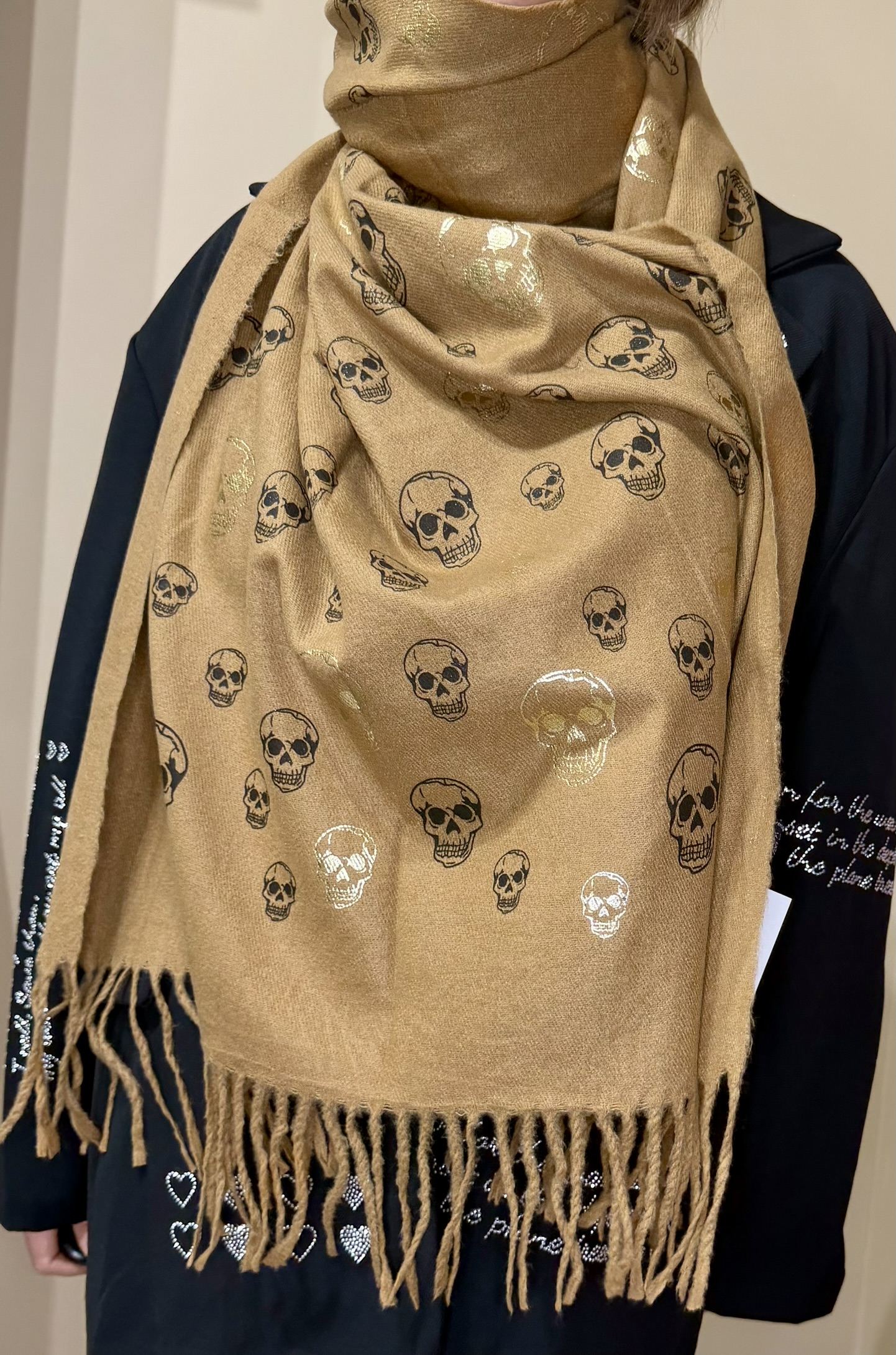 Affiche ton style rock et affirmé avec cette écharpe originale à motifs têtes de mort dorées et noires. Ultra douce et chaude, elle allie caractère et confort pour un hiver stylé.