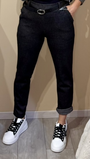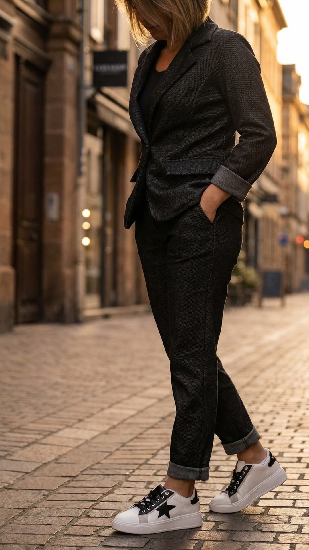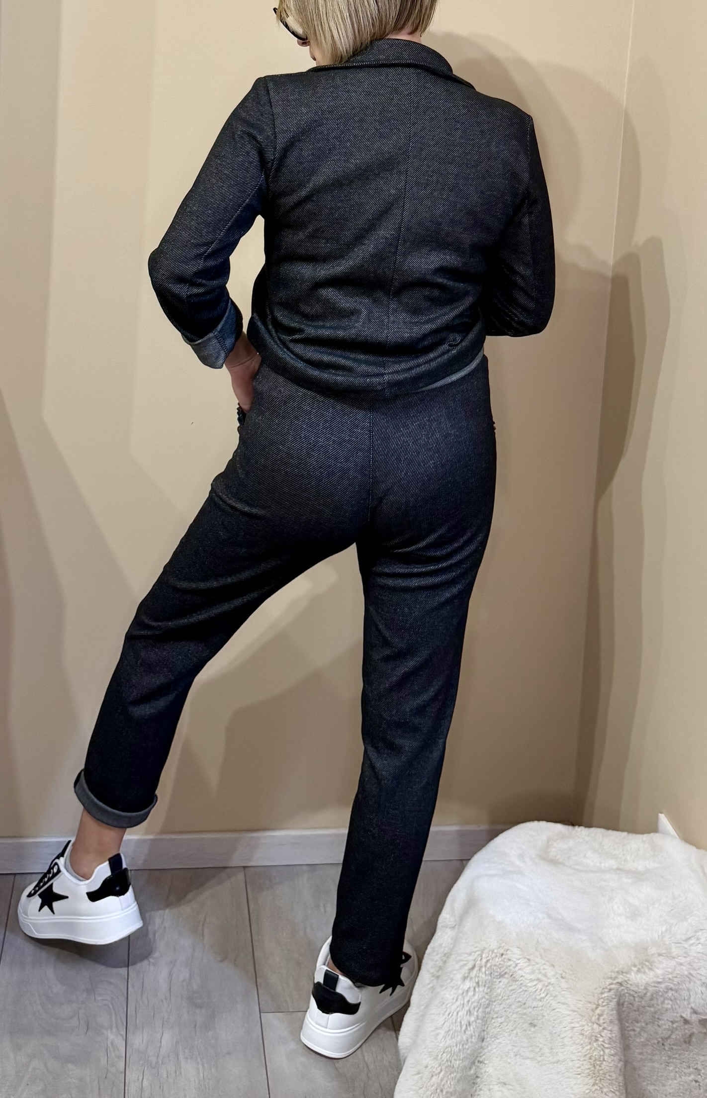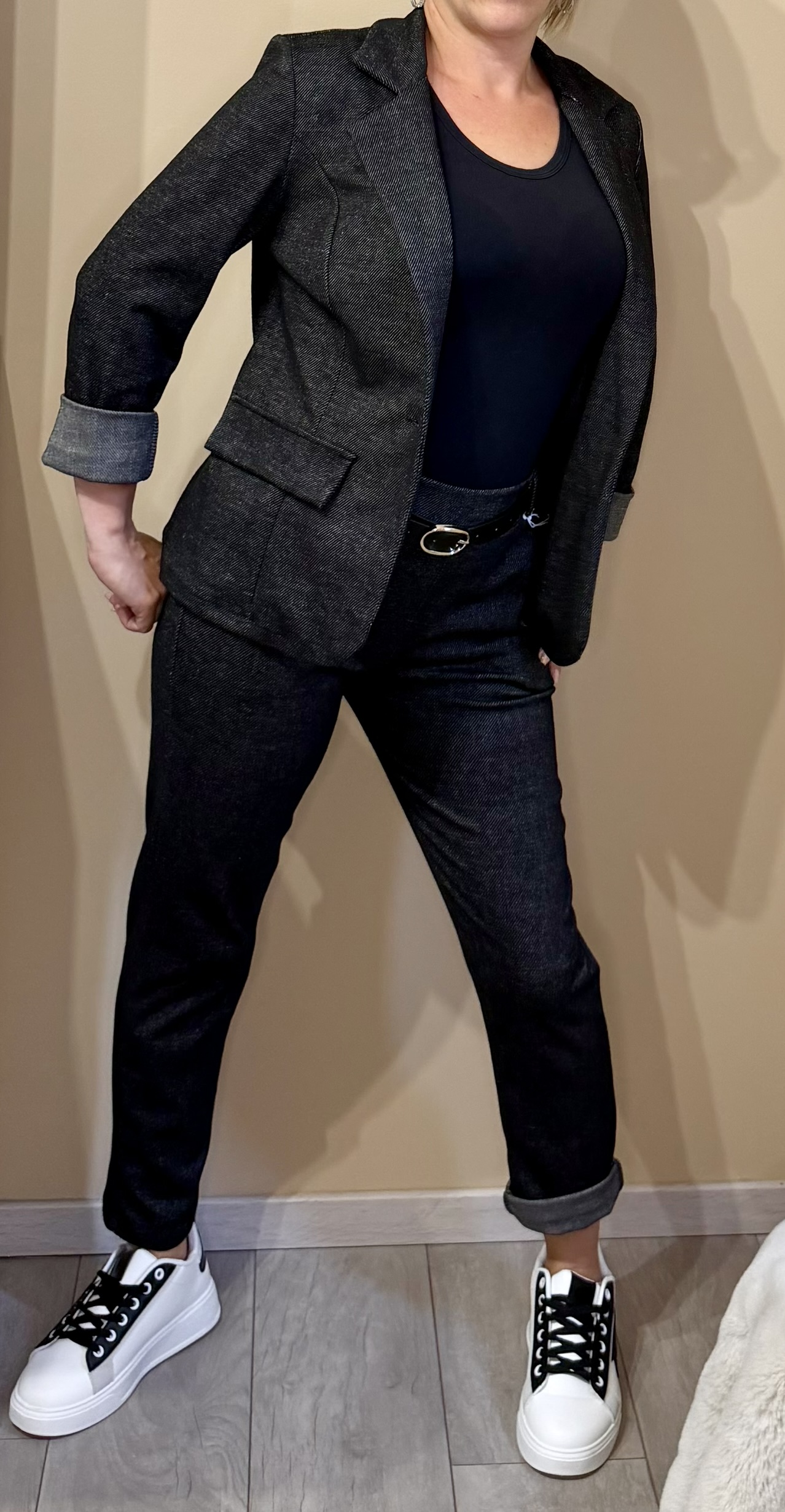 Le blazer cintré sublime la silhouette, tandis que le pantalon à poches plissées et ceinture assortie offre une touche moderne.
