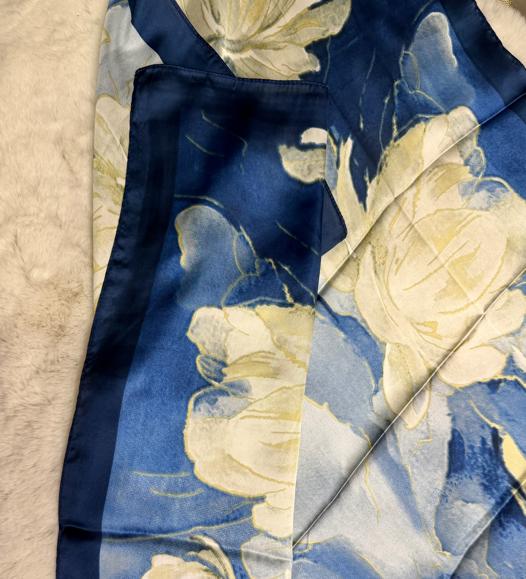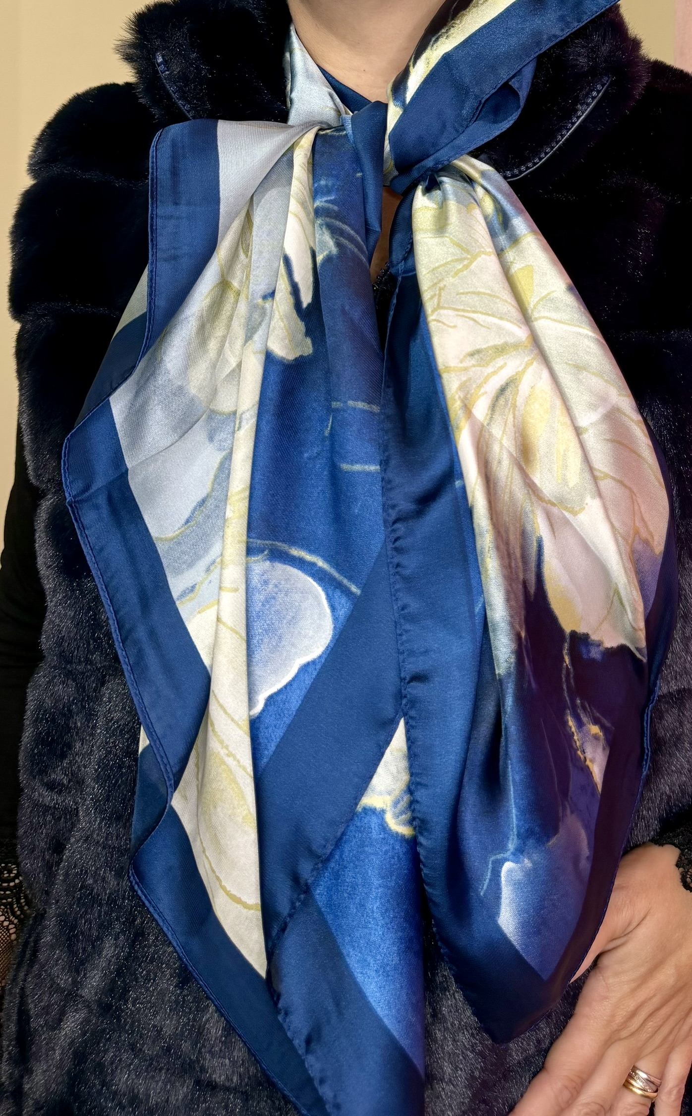 Apporte une touche de poésie florale à ton style avec ce foulard carré aux sublimes teintes de bleu, relevées par de grandes fleurs blanches élégantes. Son imprimé délicat évoque un jardin nocturne apaisant, tout en modernité et en raffinement.