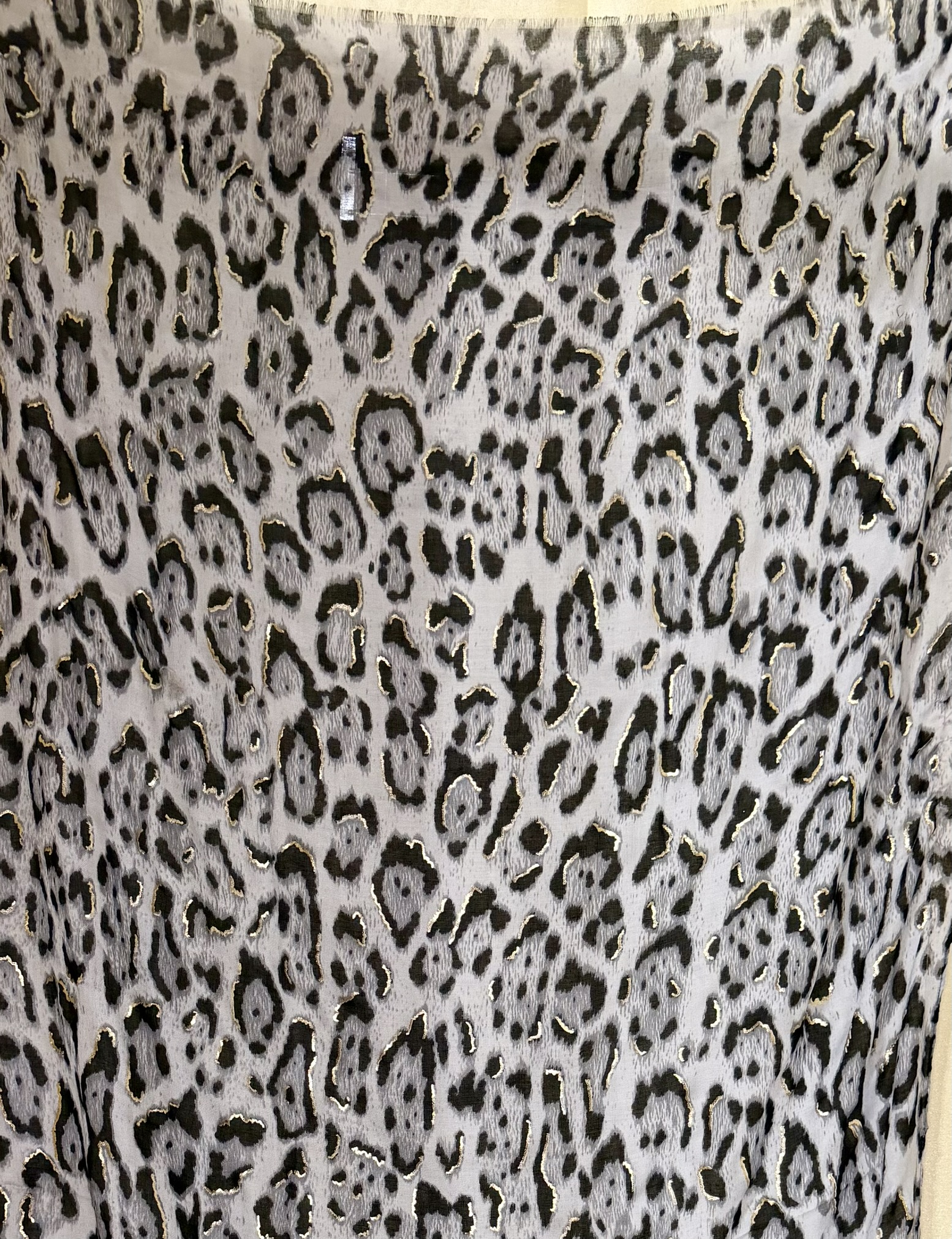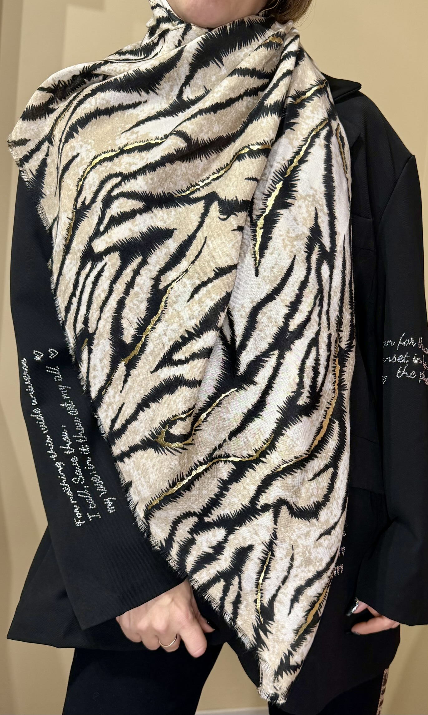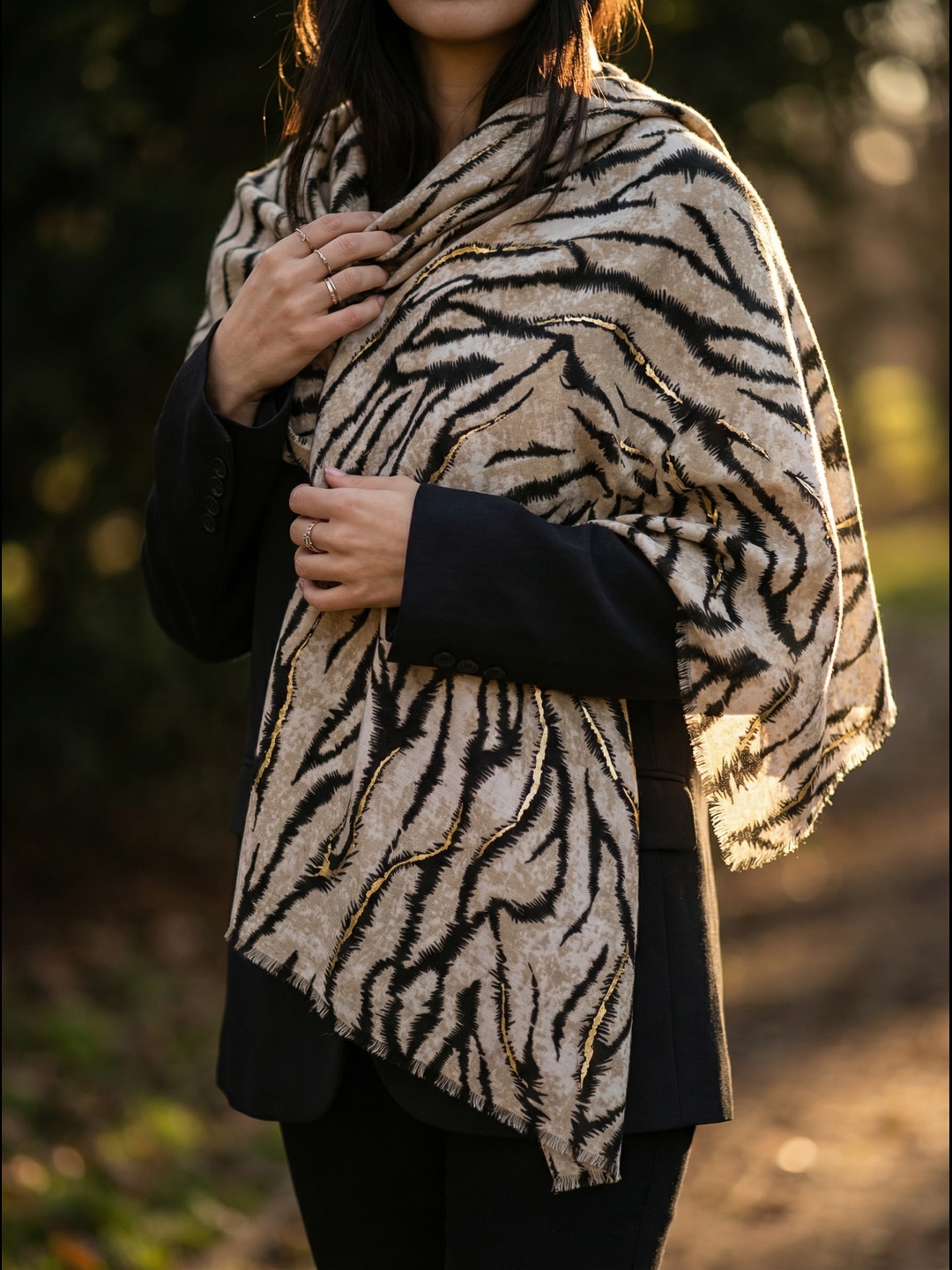 Ce foulard au motif panthère revisité séduit par son alliance parfaite entre élégance et esprit sauvage. Son imprimé sublimé par de délicates touches dorées apporte une note lumineuse et raffinée à toutes vos tenues.