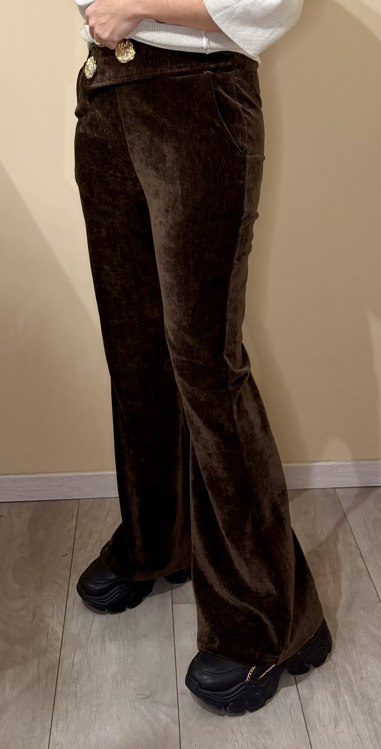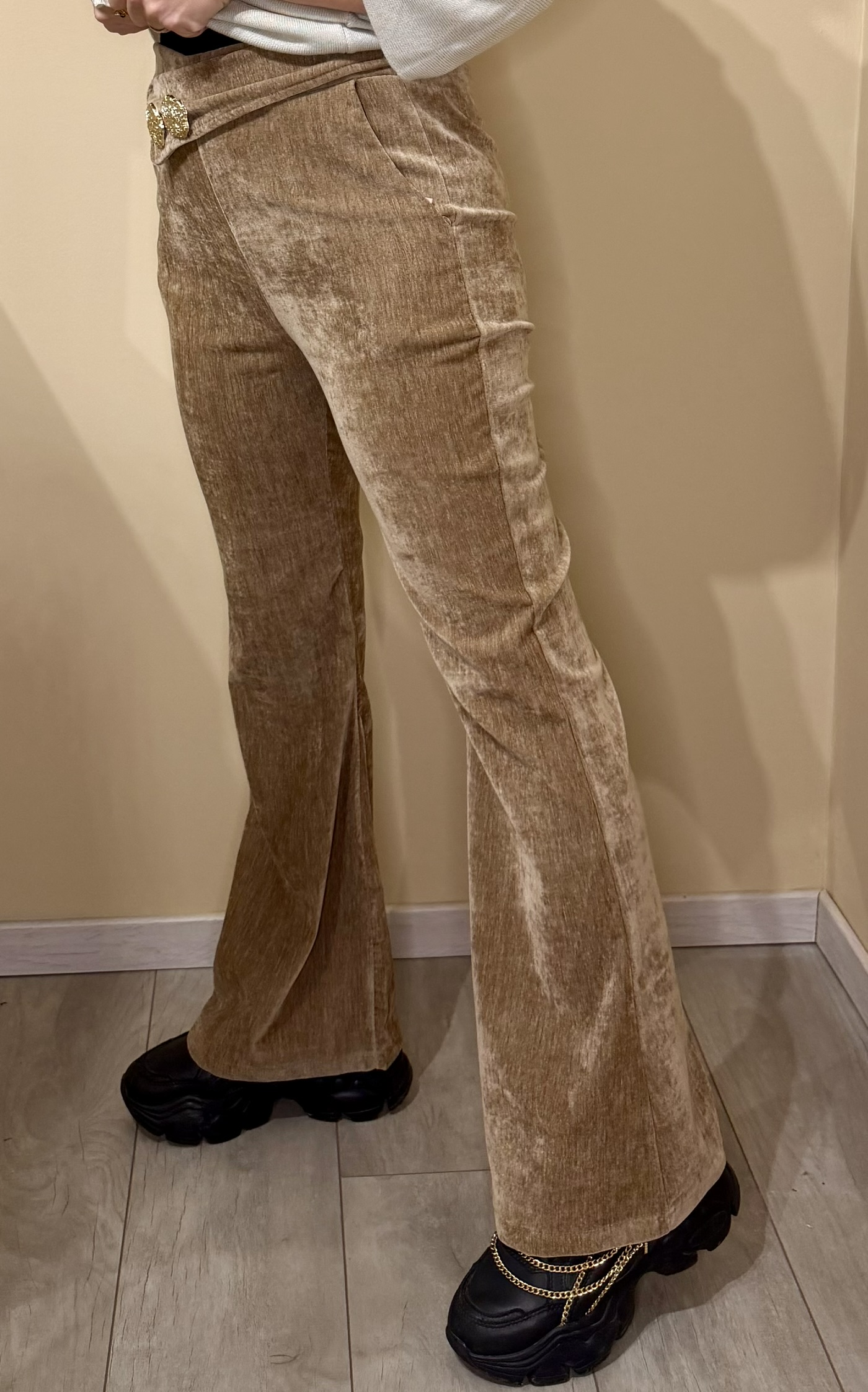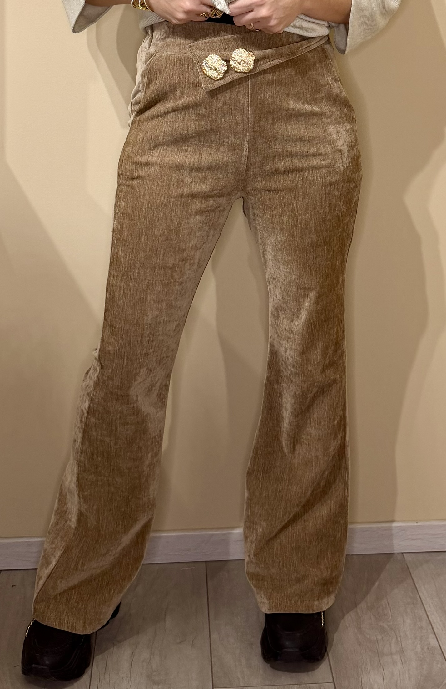 Sublime ta silhouette avec ce pantalon évasé en velours côtelé au style chic et rétro. Sa matière douce et extensible épouse parfaitement les formes tout en offrant un confort absolu. La taille haute est mise en valeur par une élégante broche dorée qui apporte une touche glamour et raffinée.