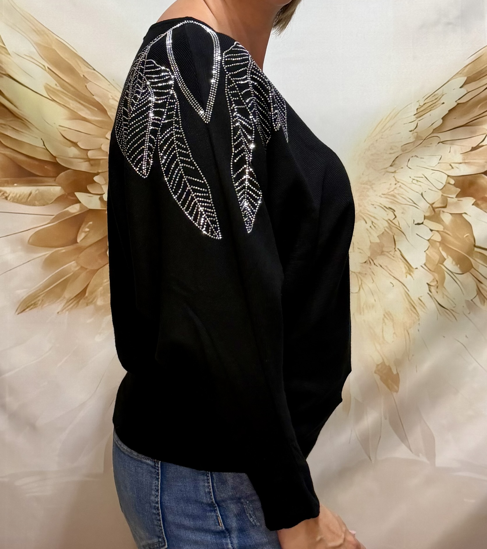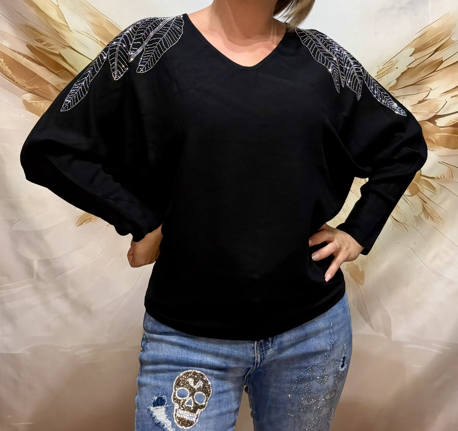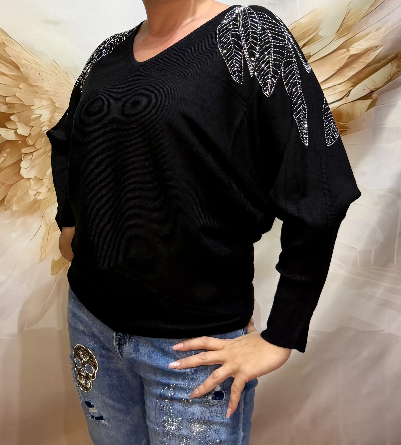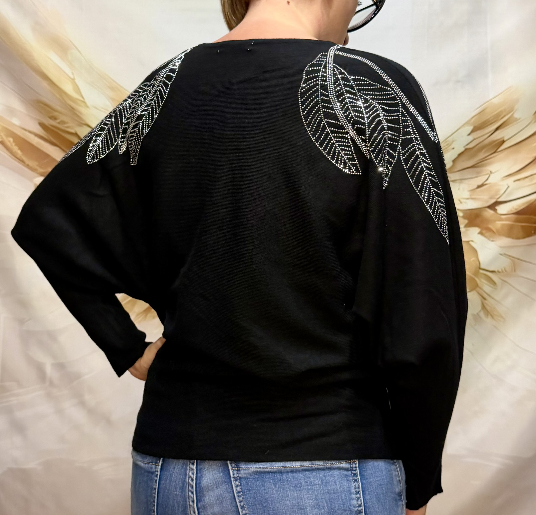 Brille avec élégance grâce à ce pull en maille à manches chauve-souris orné de feuilles en strass scintillantes sur les épaules.