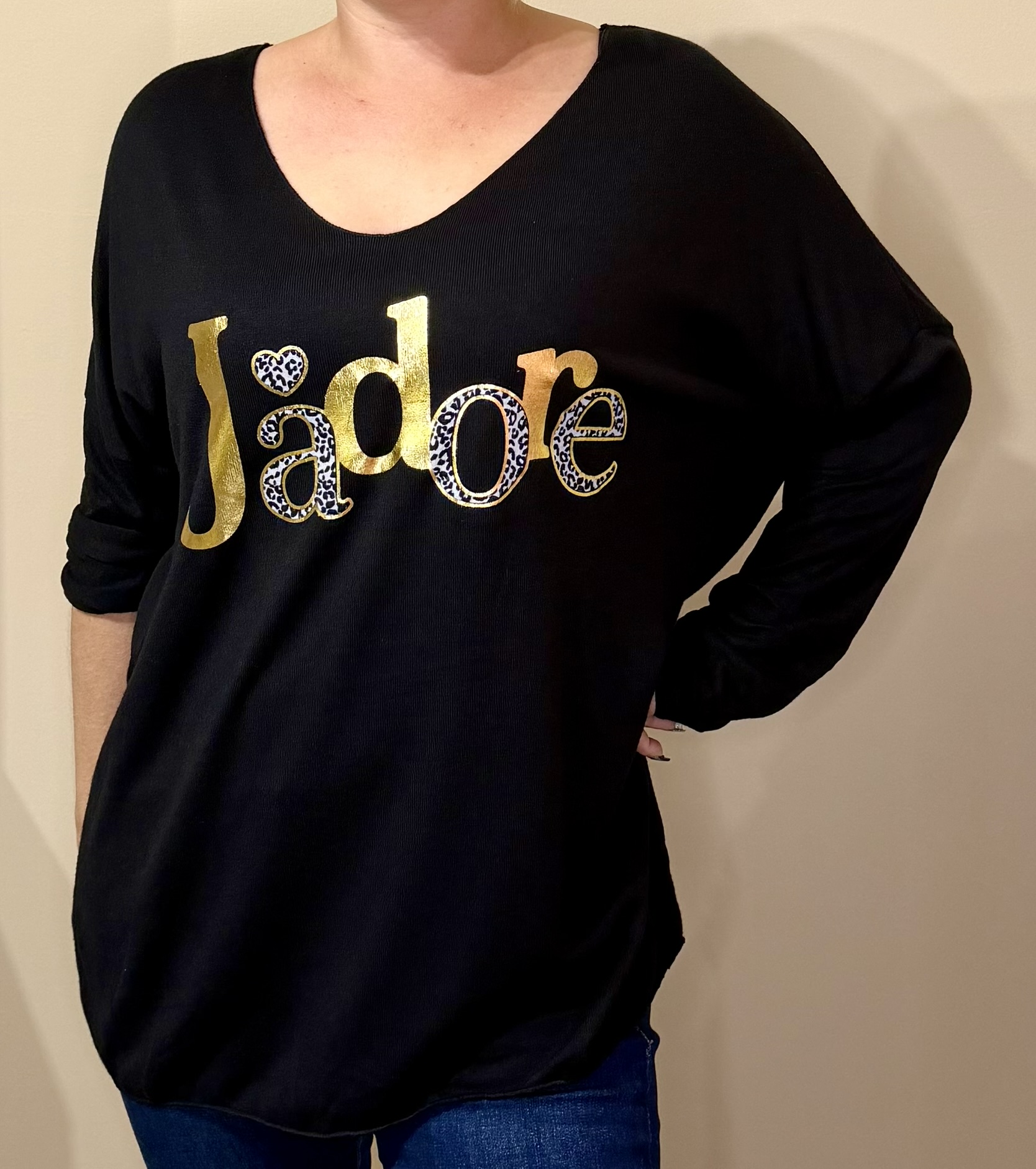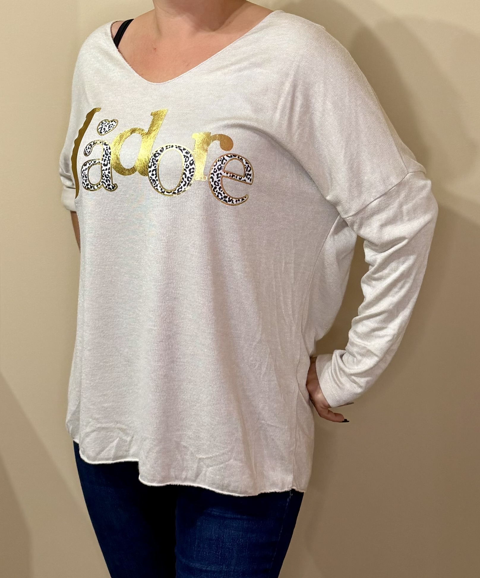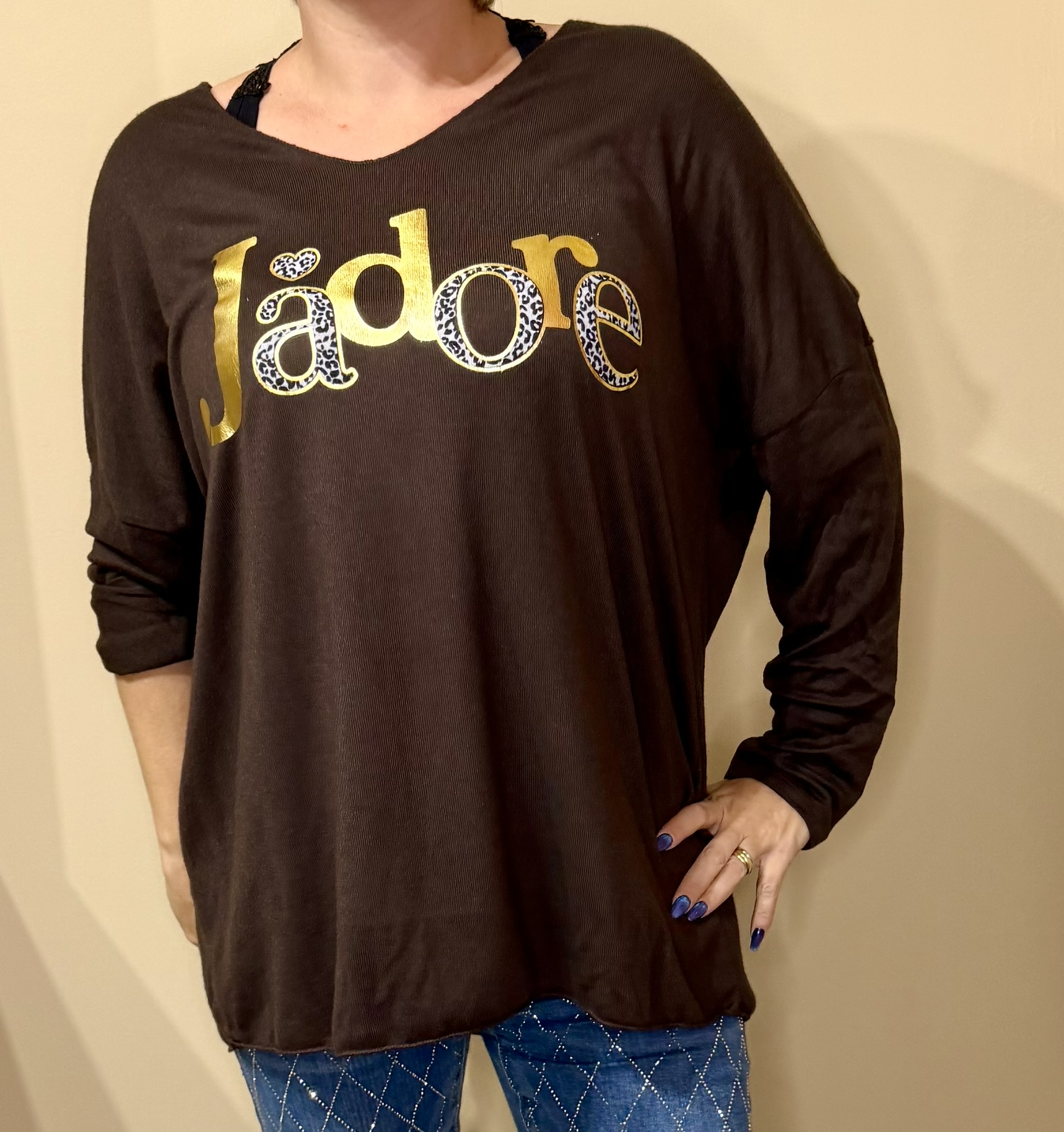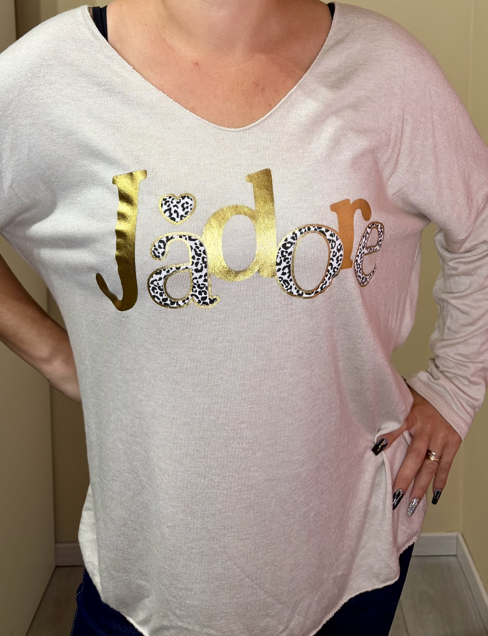 Affiche ton amour du style avec ce pull chic et confortable à l’imprimé “J’adore” doré et léopard. Sa coupe fluide, son col en V flatteur et sa matière douce en font le parfait allié de ton dressing.