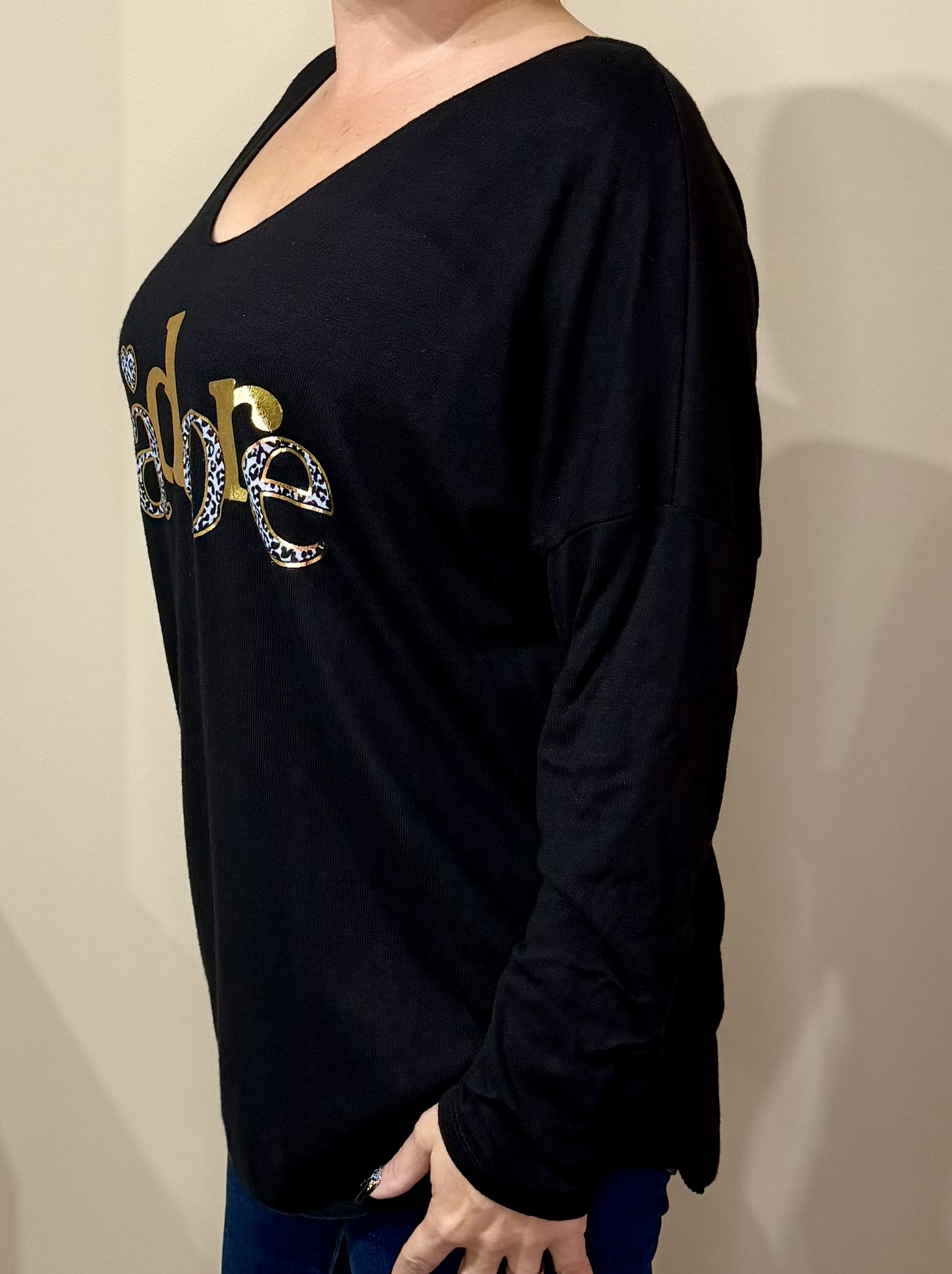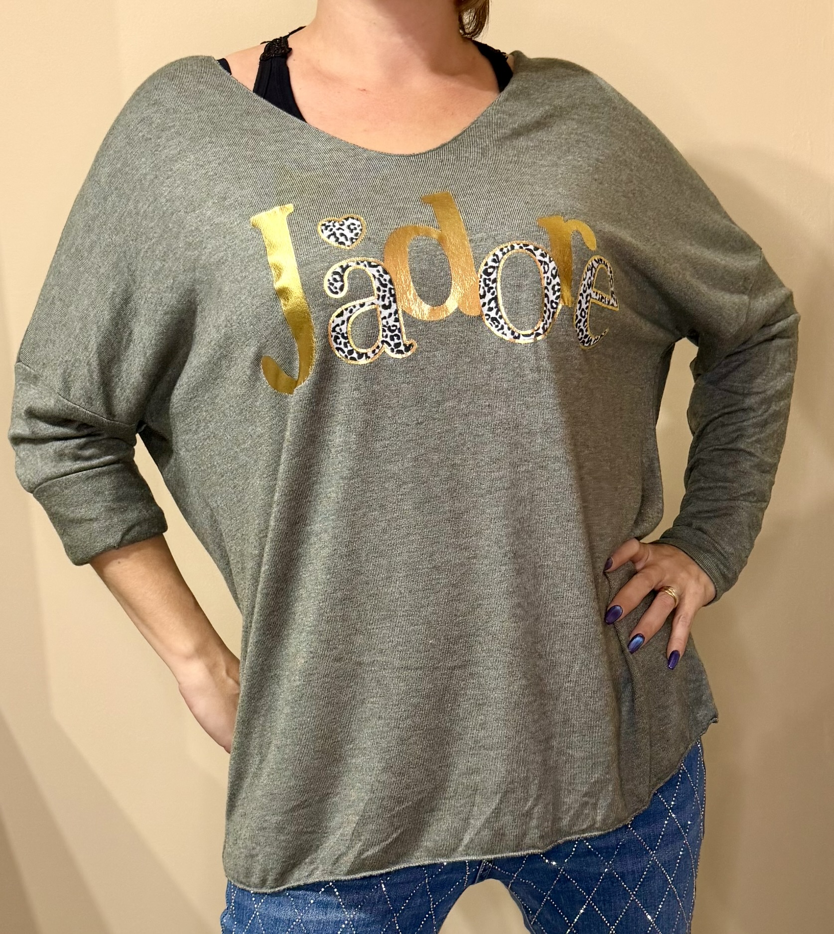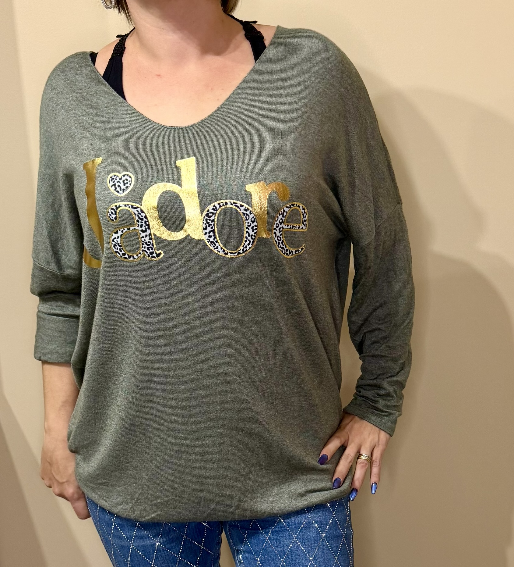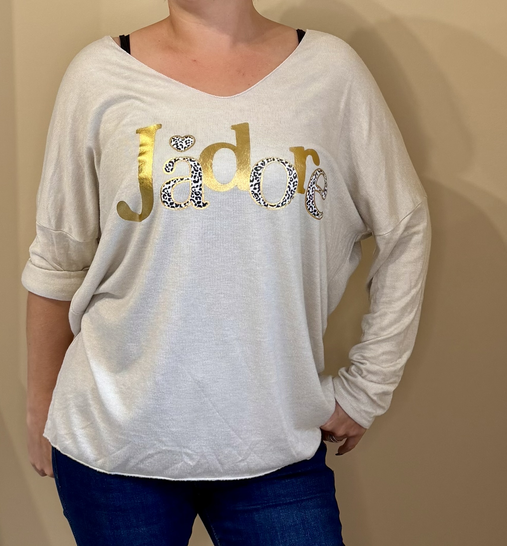 Affiche ton amour du style avec ce pull chic et confortable à l’imprimé “J’adore” doré et léopard. Sa coupe fluide, son col en V flatteur et sa matière douce en font le parfait allié de ton dressing.