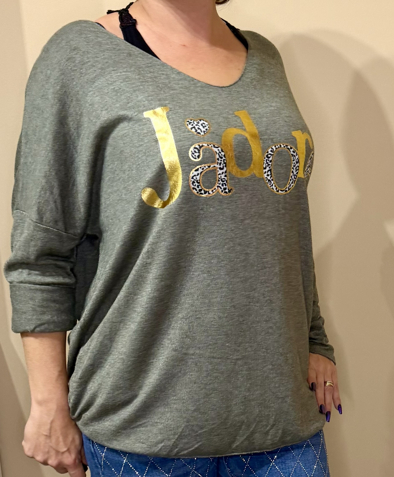 • Détail imprimé : “J’adore” doré avec touches léopard