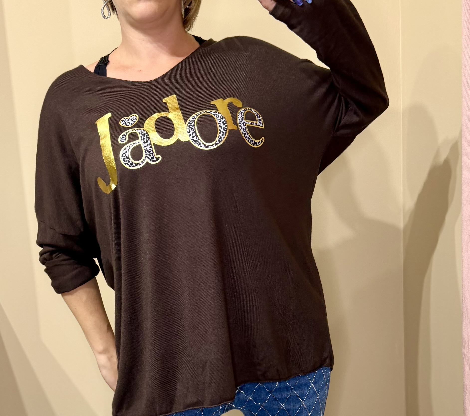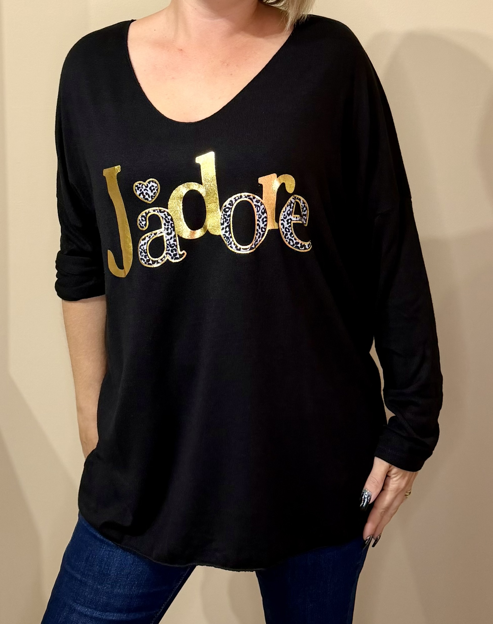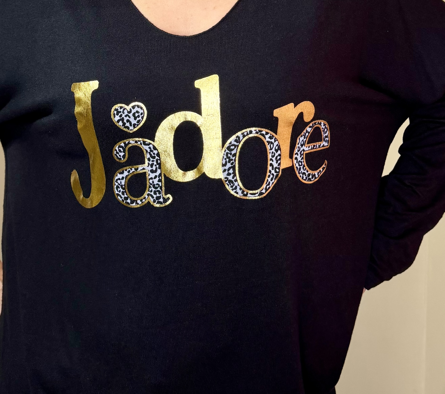 - Détail imprimé : “J’adore” doré avec touches léopard