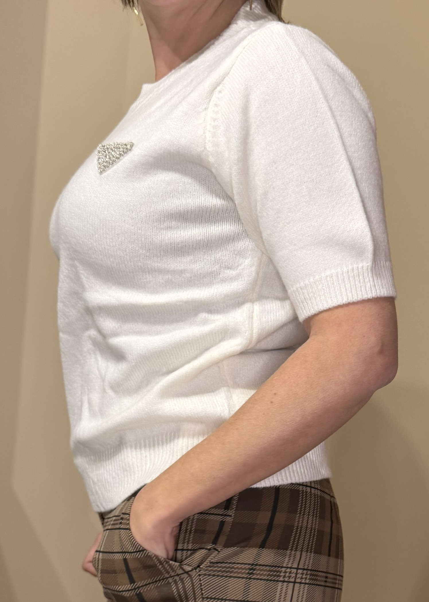 Sa matière douce et confortable épouse la silhouette sans la marquer, tandis que les manches courtes en font une pièce idéale pour la mi-saison ou à superposer sous une veste. Le détail strass apporte une note raffinée qui fait toute la différence.
