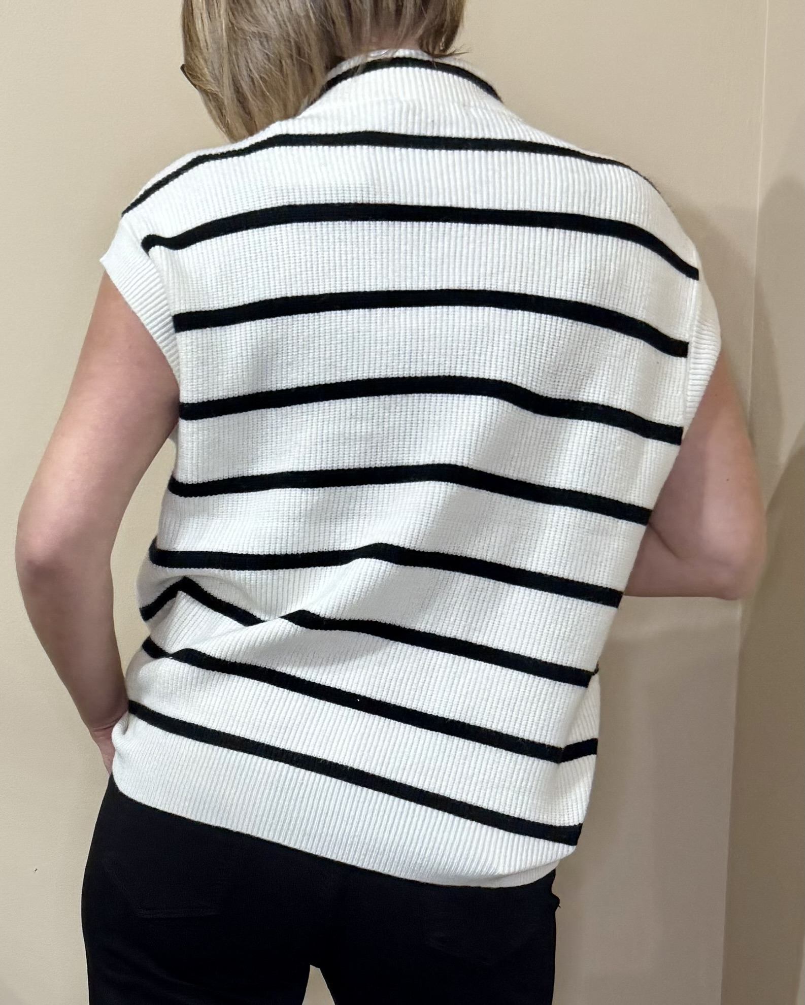 Craque pour ce pull sans manches en maille rayée, à la fois chic et tendance. Son col montant zippé apporte une touche moderne et structurée, tandis que ses rayures contrastées offrent un style intemporel inspiré du vestiaire marin revisité.