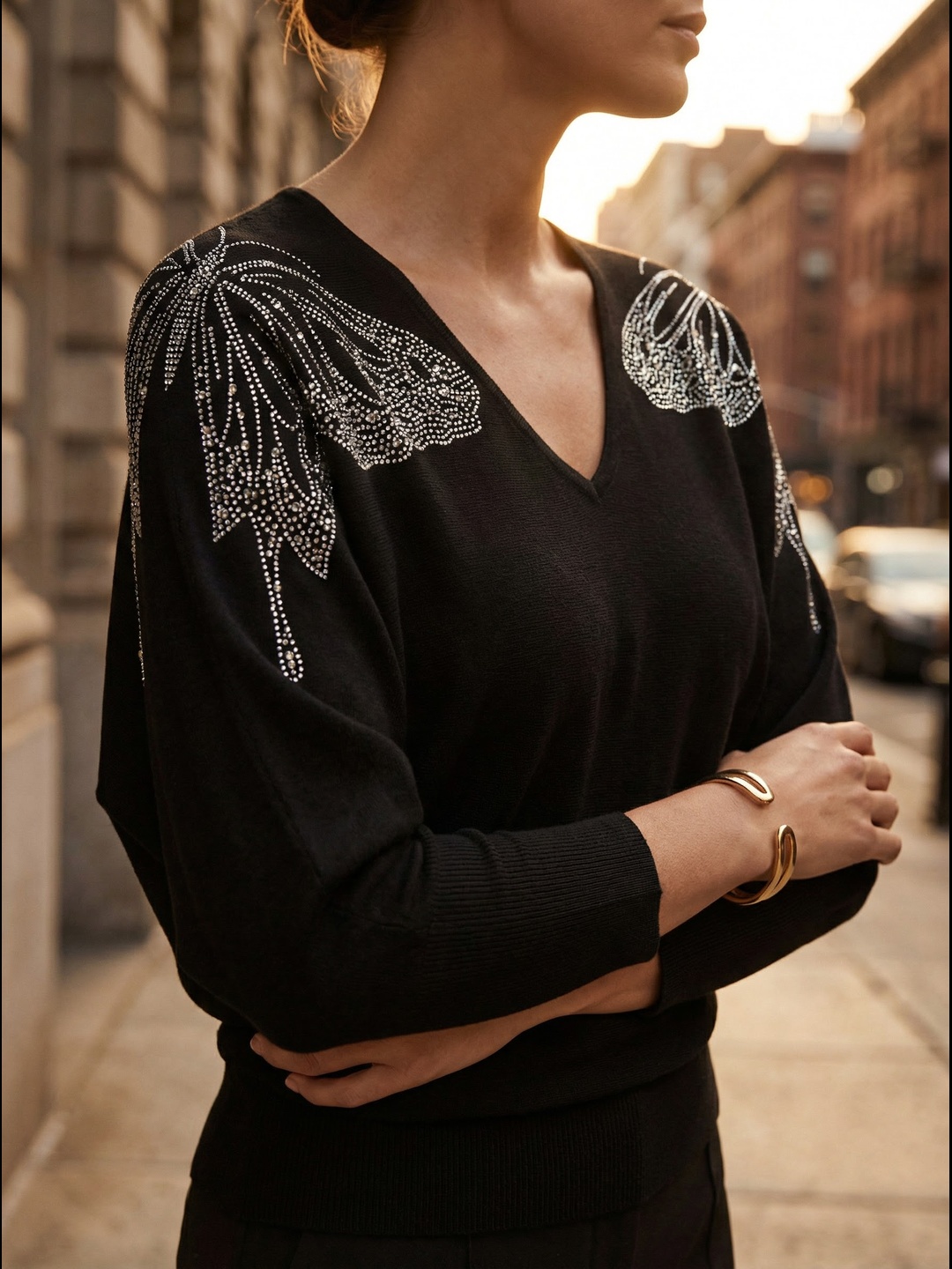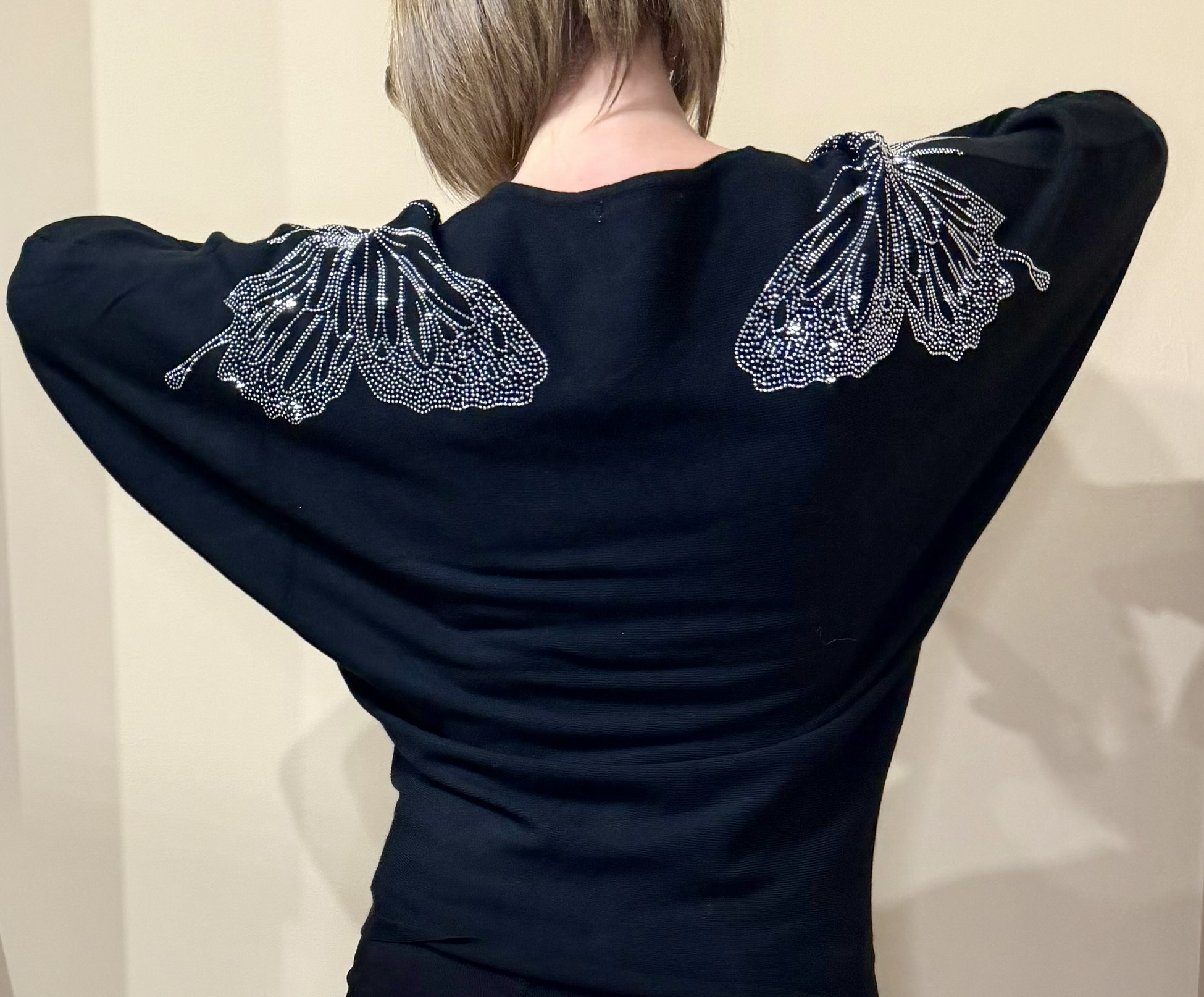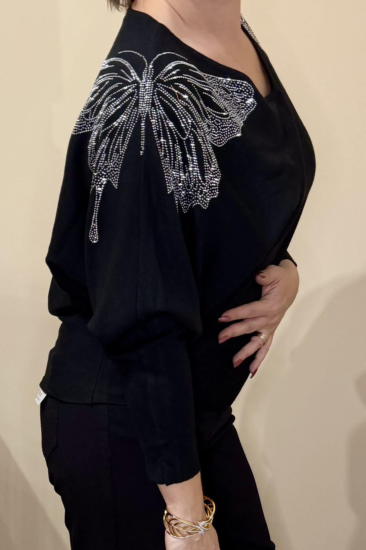 Laisse parler ton style avec ce pull à manches chauve-souris sublimé par de délicats papillons en strass sur les épaules, qui apportent une touche lumineuse et raffinée à ta tenue.