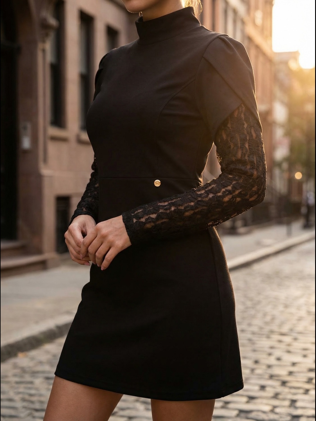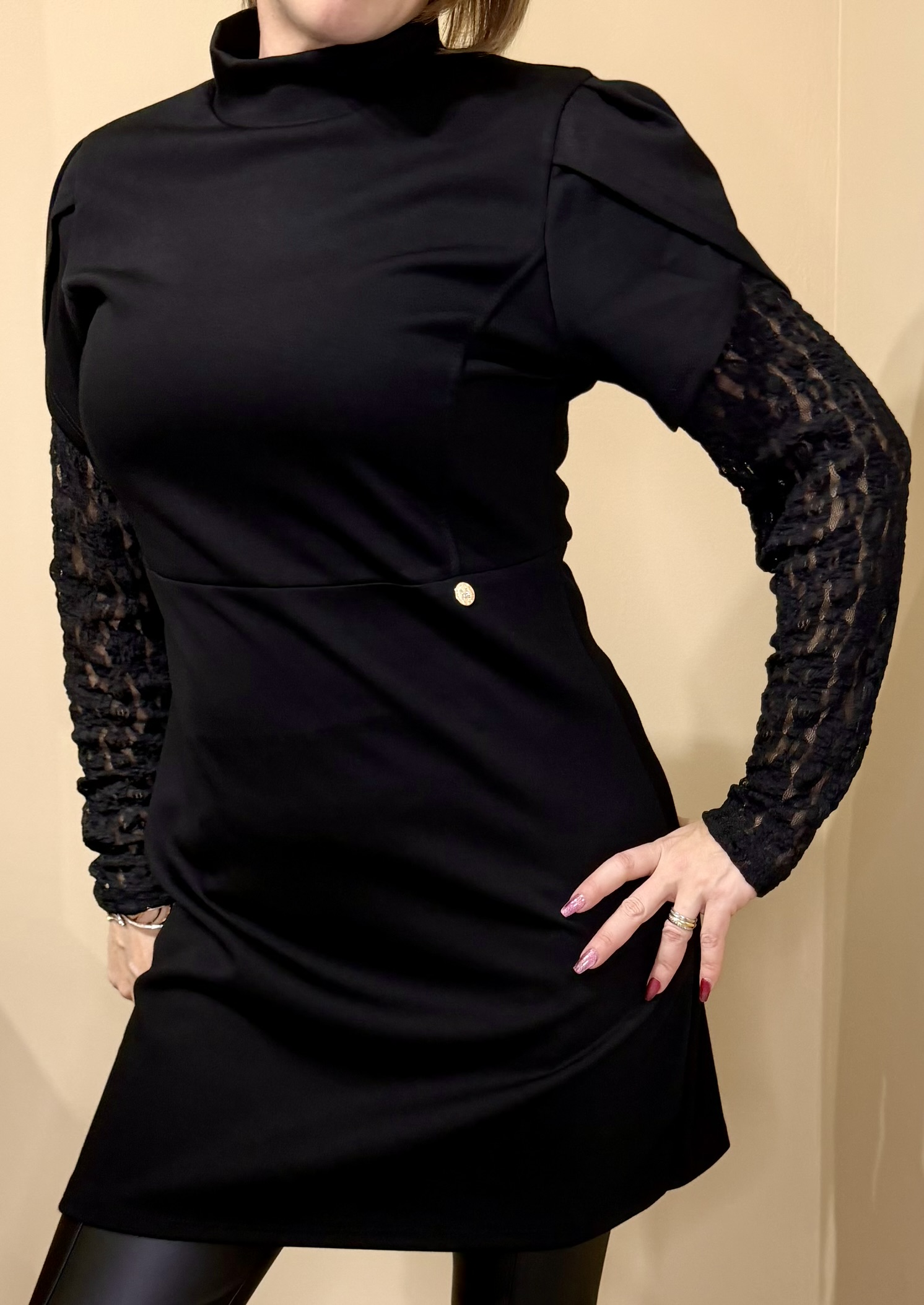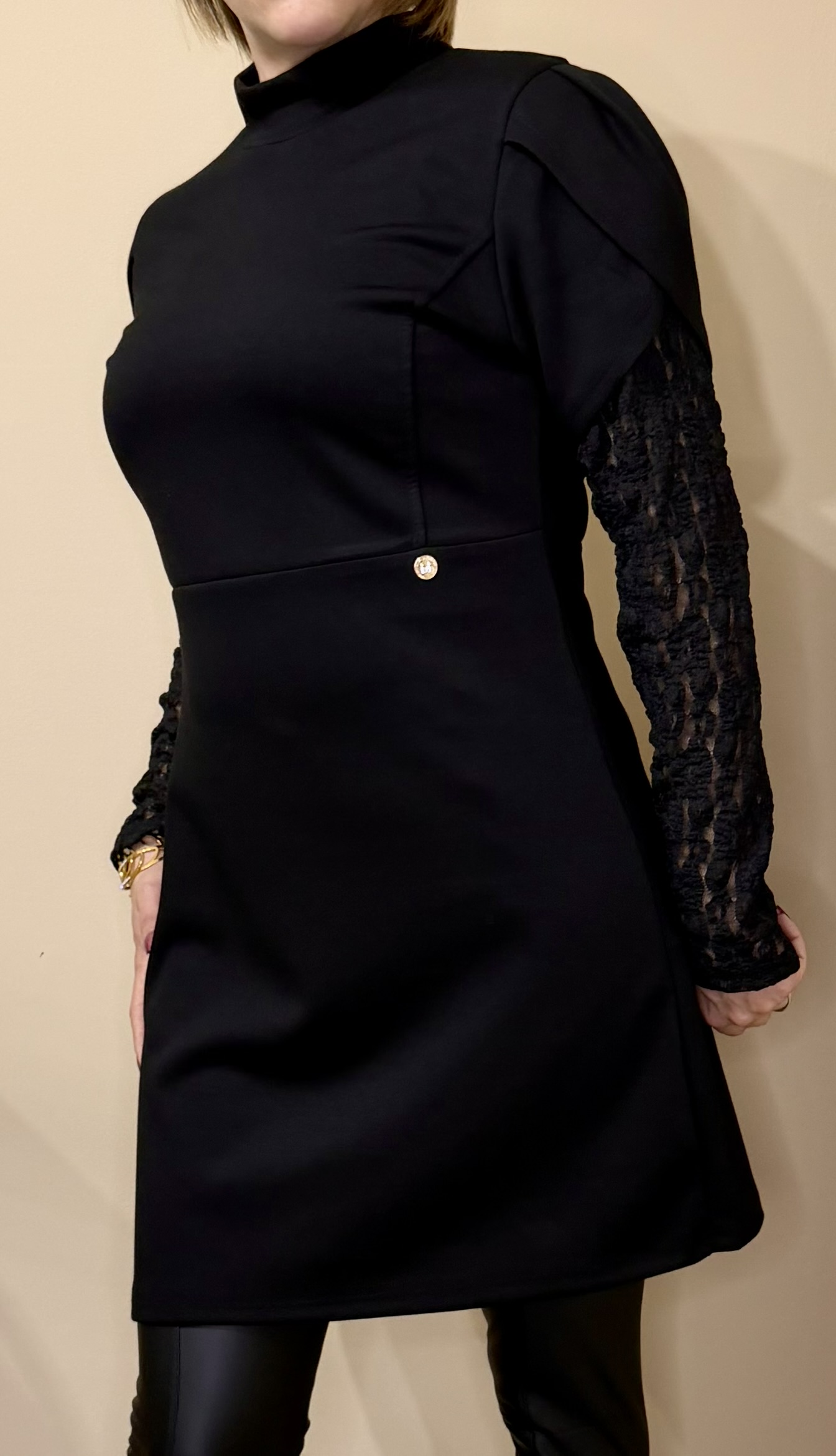 Succombe au charme de cette robe noire élégante, une pièce intemporelle qui allie sobriété et raffinement. Son design épuré est sublimé par de magnifiques manches longues en dentelle ajourée, apportant une touche féminine et sophistiquée.
