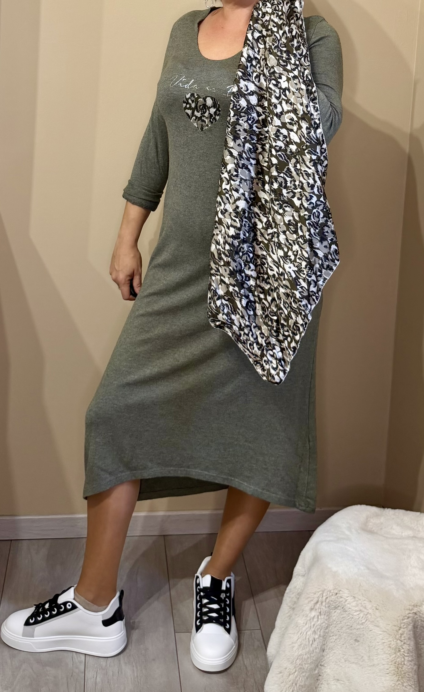 Adopte une allure pleine de charme avec cette robe longue à manches ¾, sublimée par l’inscription « Vida es Bella » et un motif cœur léopard plein de caractère.