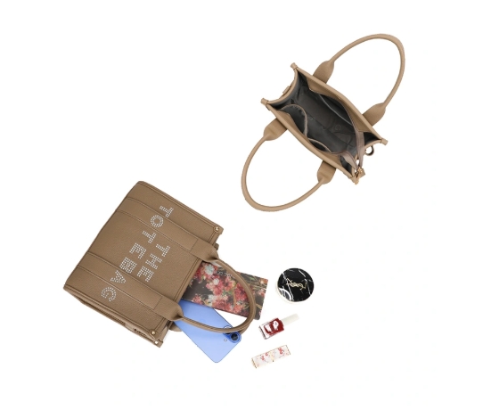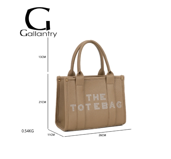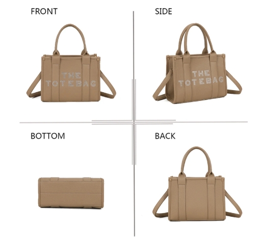 Son design épuré est sublimé par l’inscription “THE TOTE BAG” ornée de strass discrets, pour un rendu élégant et féminin.