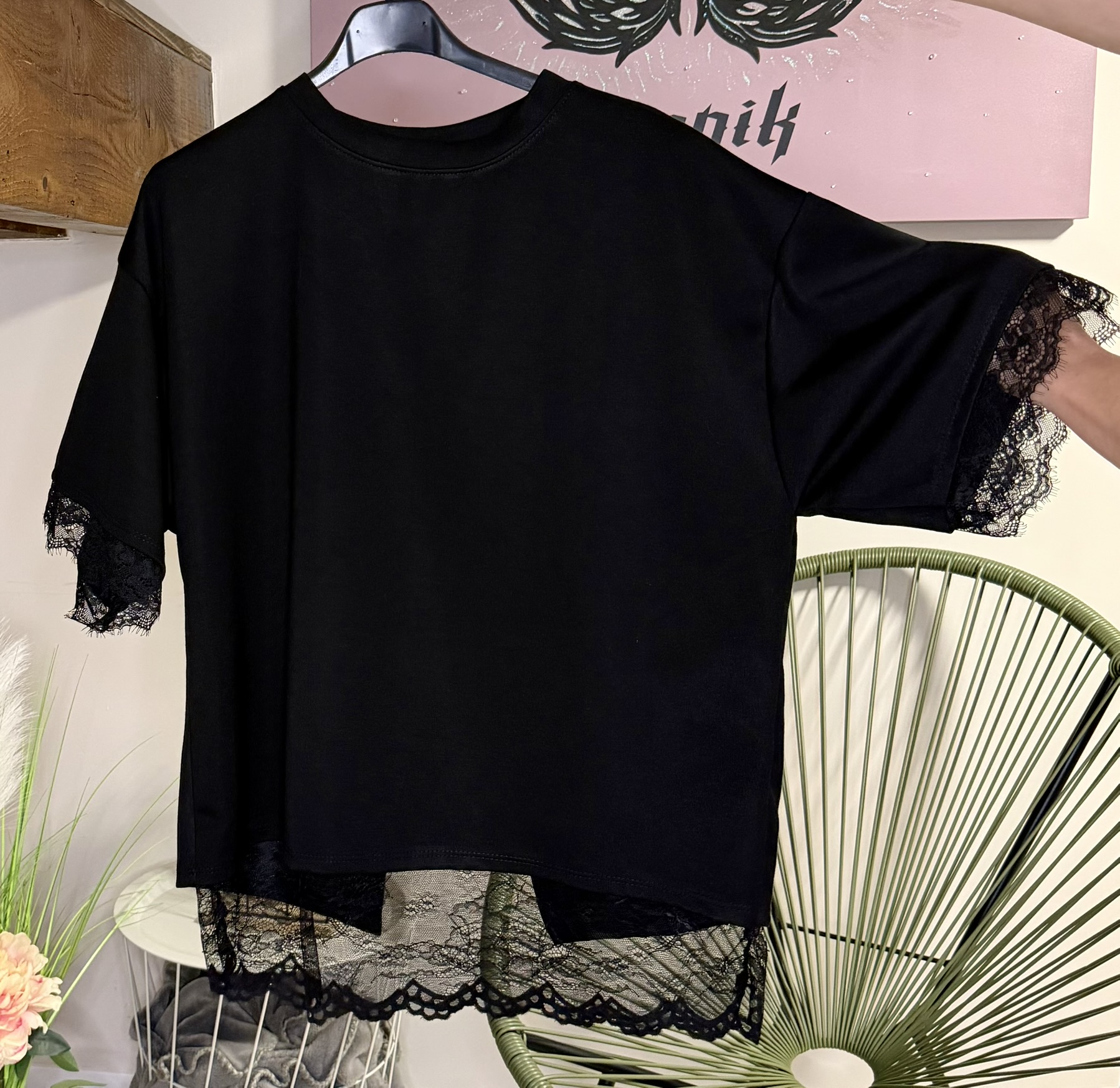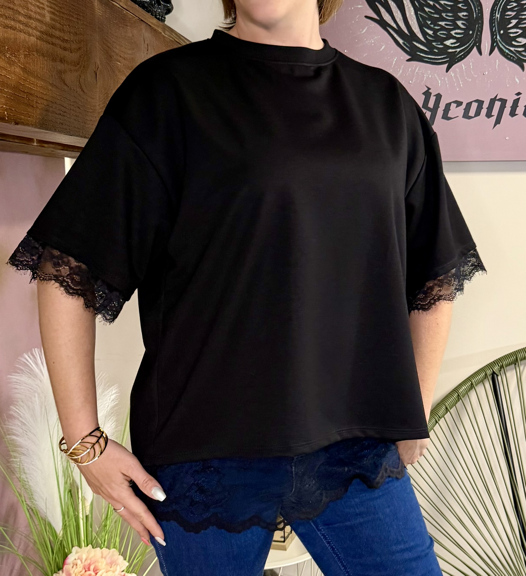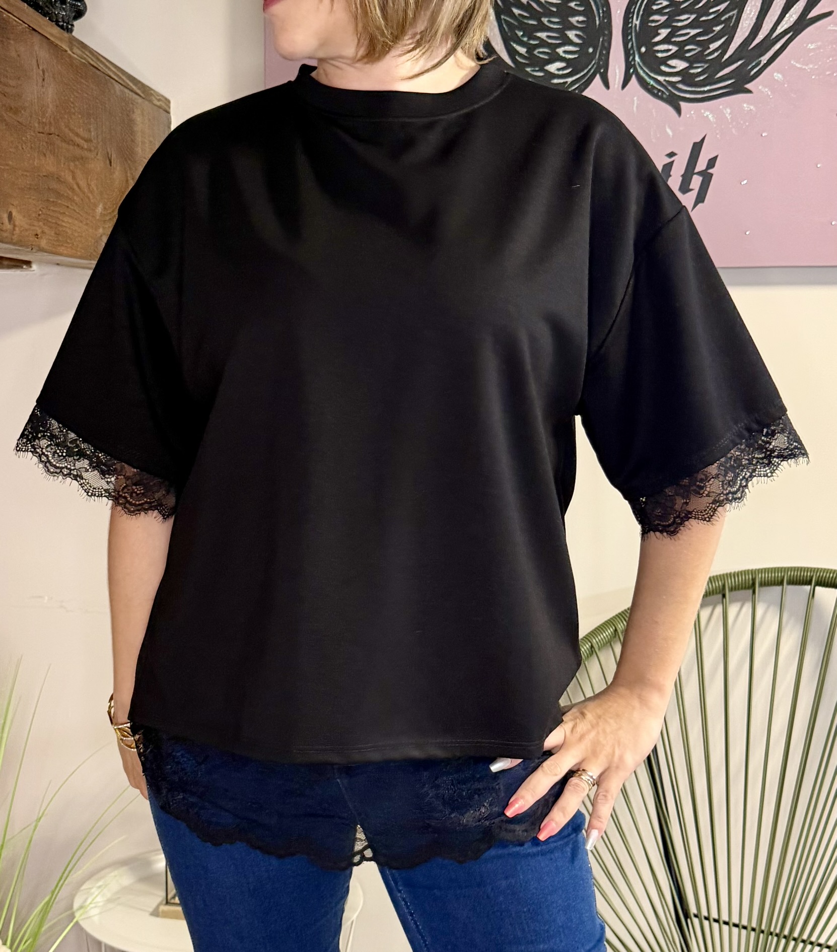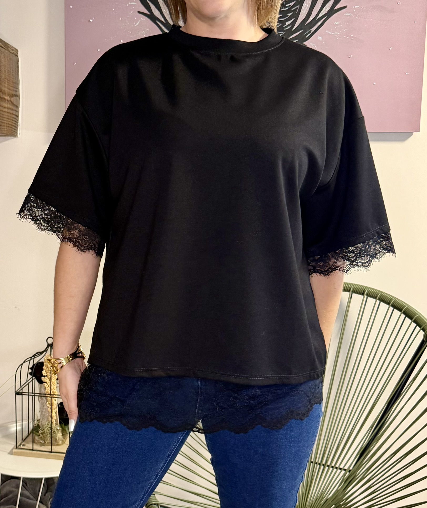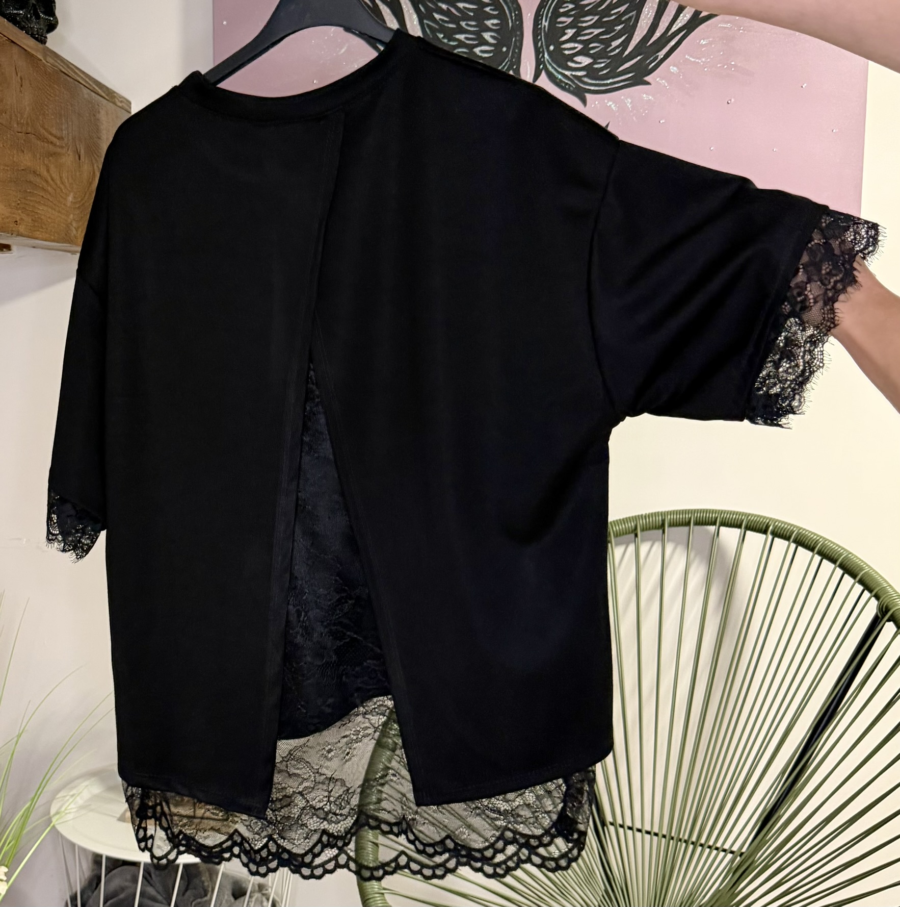 Sa coupe fluide et confortable s’adapte facilement à toutes les morphologies, tandis que les finitions en dentelle au dos, aux manches et à la base ajoutent du caractère et du style.